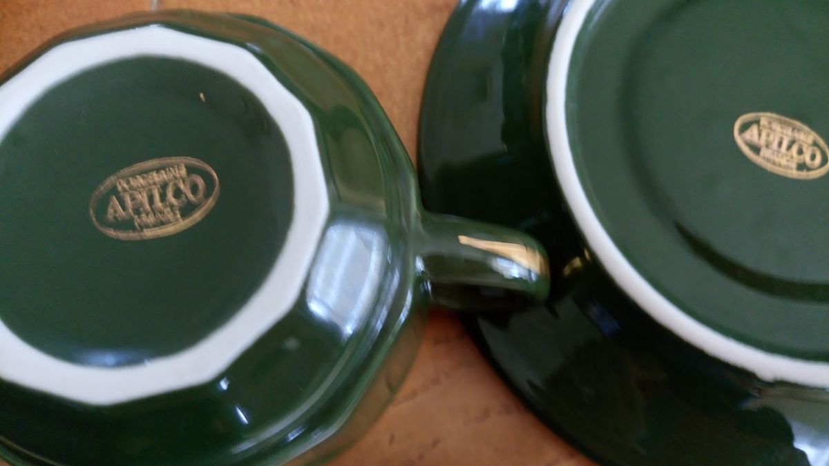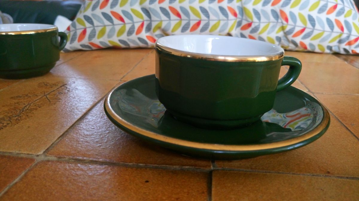 Porcelaine: extérieur vert, intérieur blanc, liseré doré