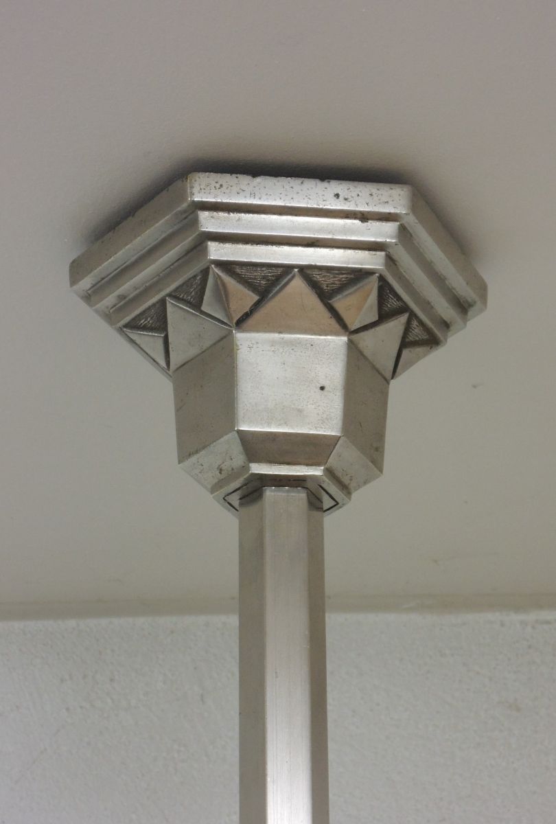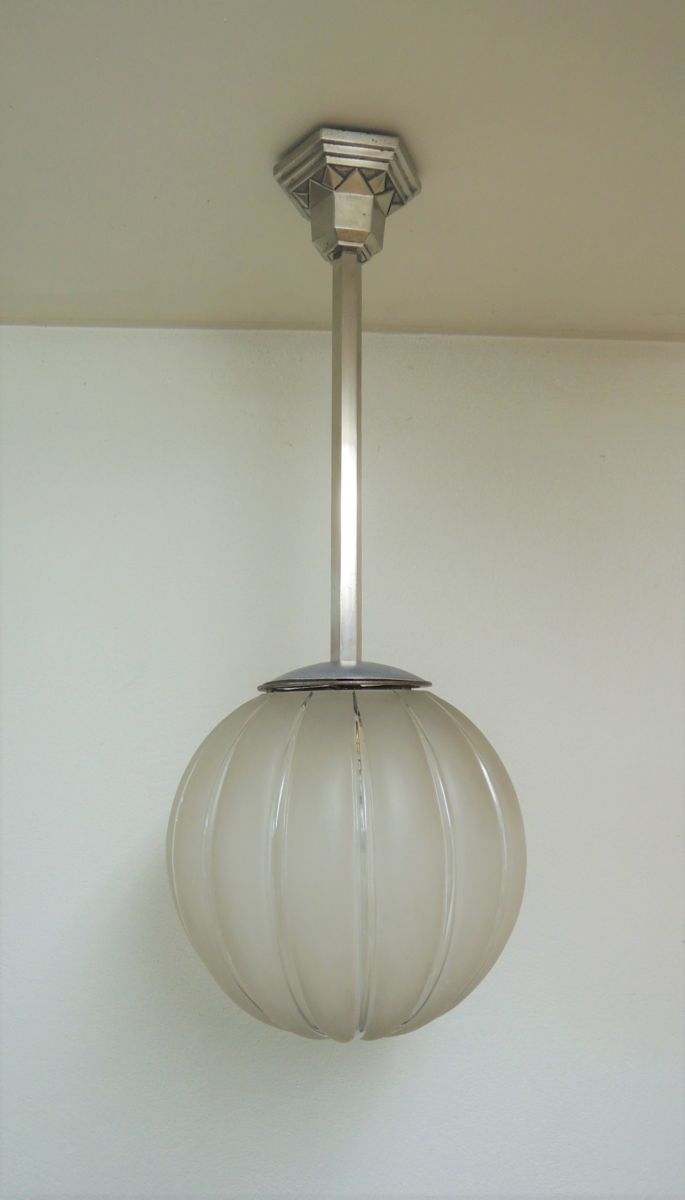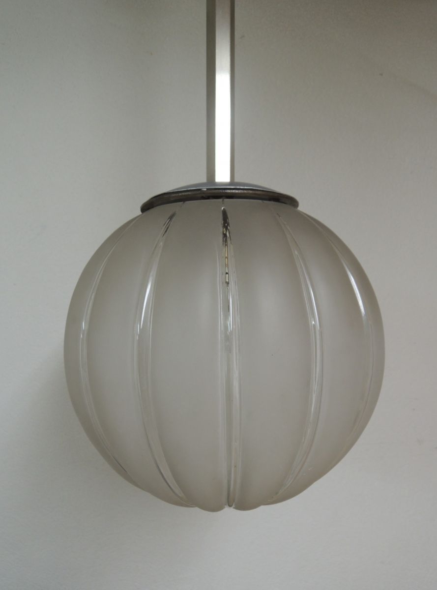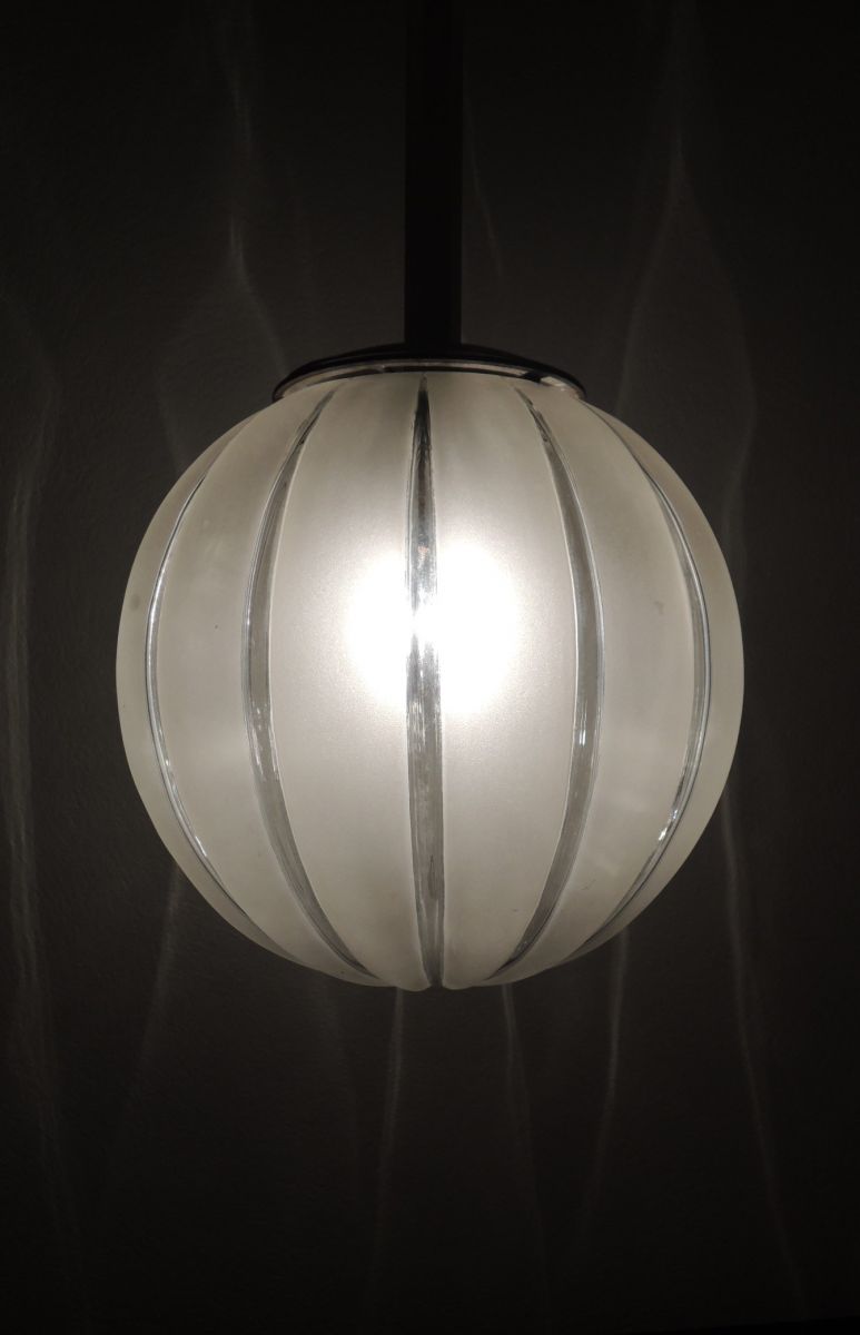 Grande suspension (longueur 80cm) sur tige hexagonale métal (50cm), globe (30cm)en verre divisés en quartiers sablés séparés par quartiers fins polis, pavillon métal épais (coulé), douille B22. Bon état. 3.5 kg
