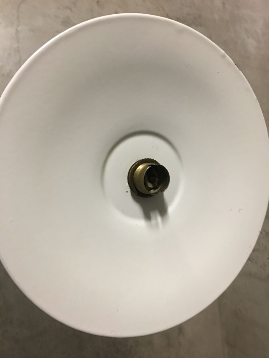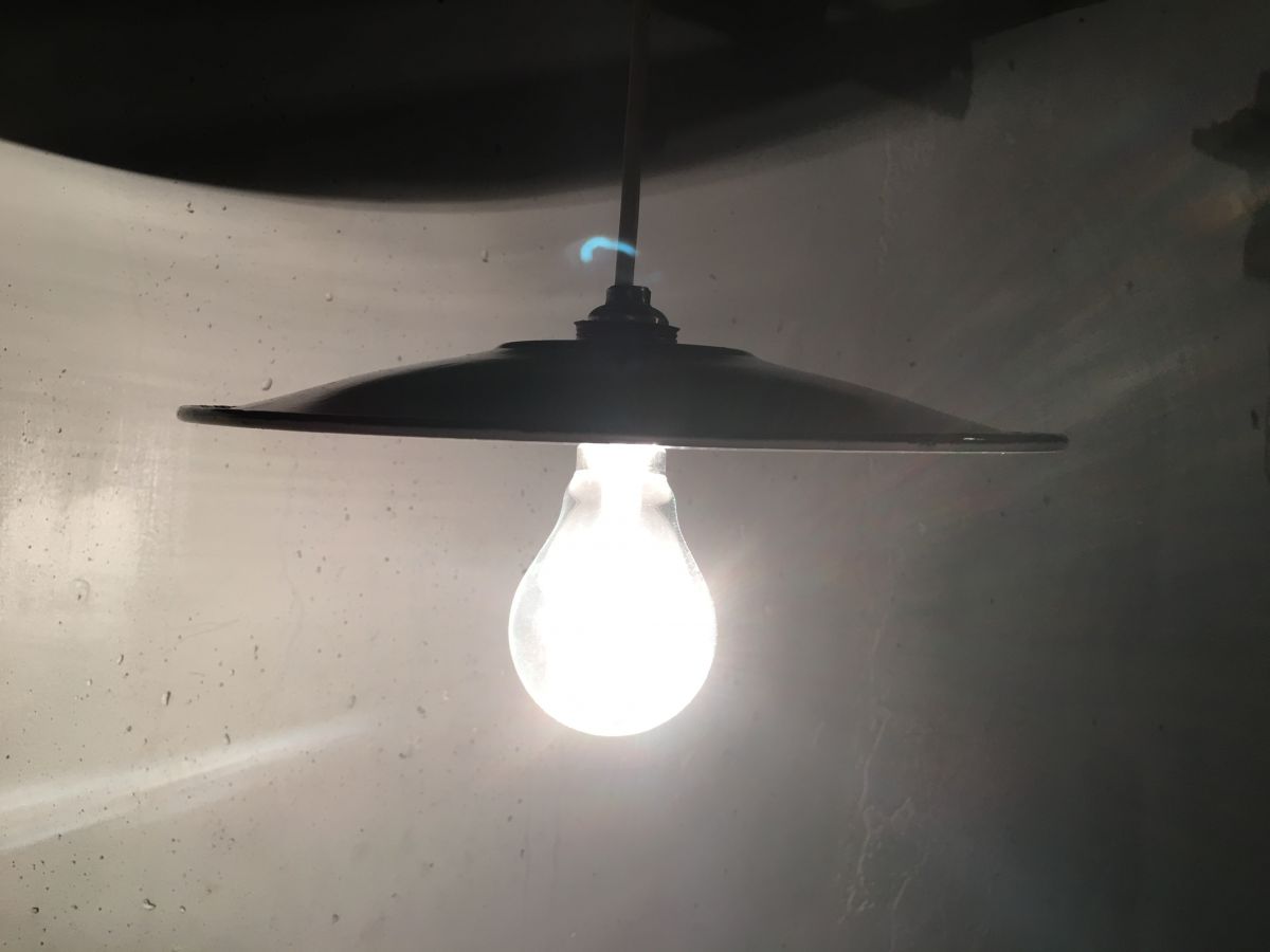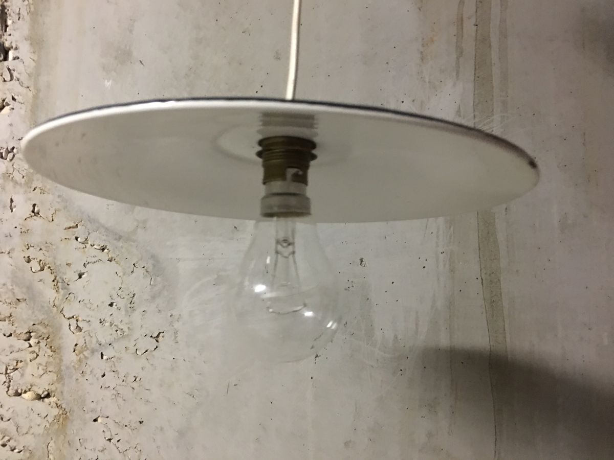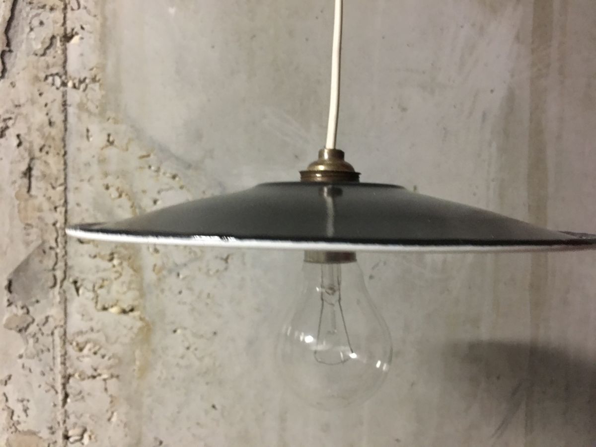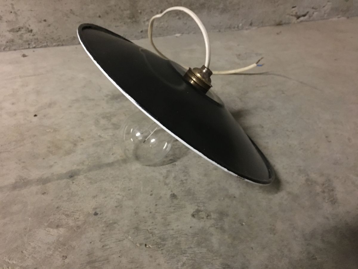 Suspension gamelle industrielle noire des années 50 en tôle émaillée noire, quelques infimes éclats (voir photos) qui contribuent au vécu et au charme de la lampe, parfait état de marche, hauteur 3cm, diamètre 24cm, douille en laiton, fil électrique changé, bon état.