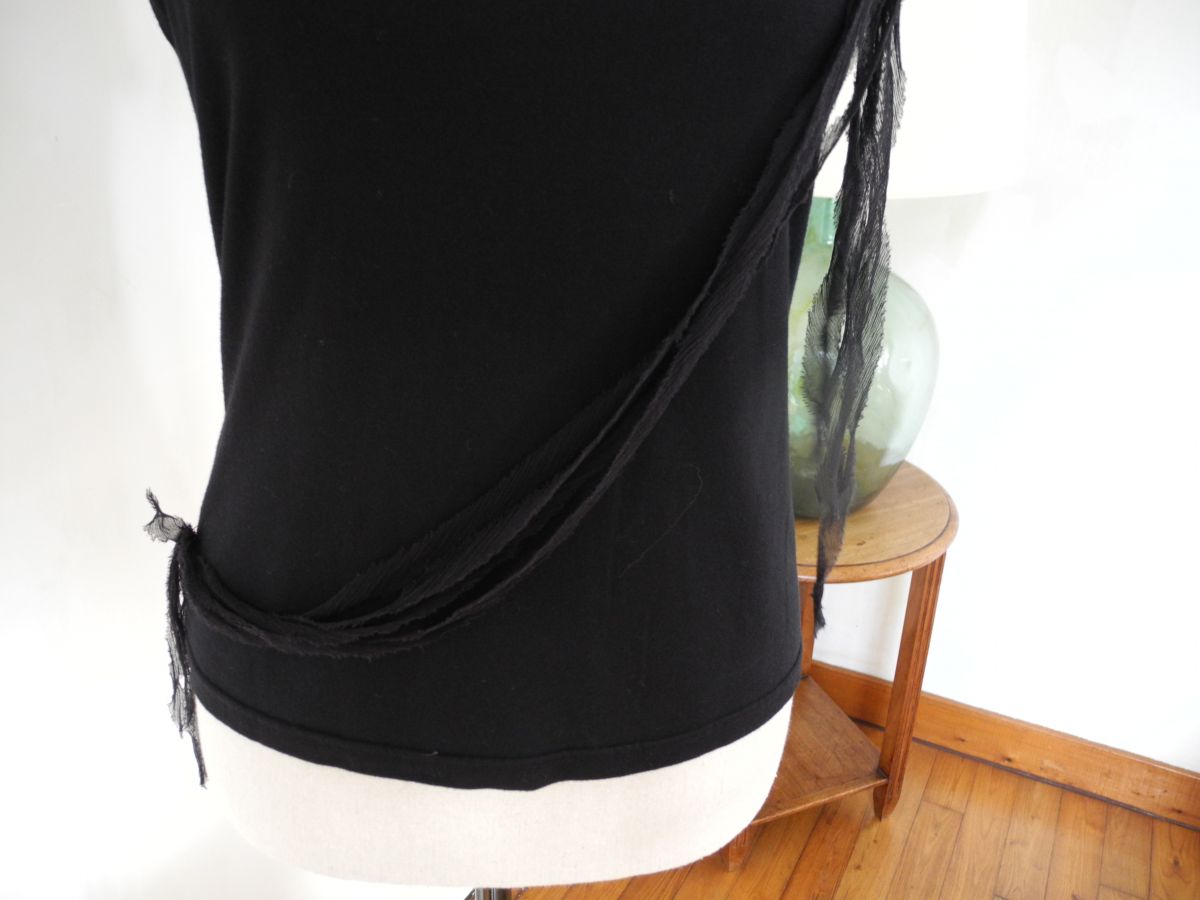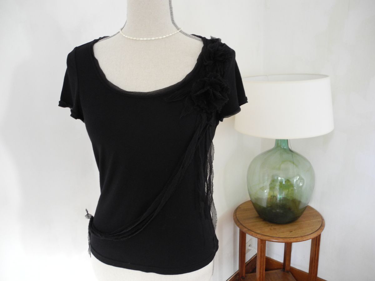 Avec deux fleurs de tulle de soie- une petite et une plus grande - en relief sur le côté gauche en haut.