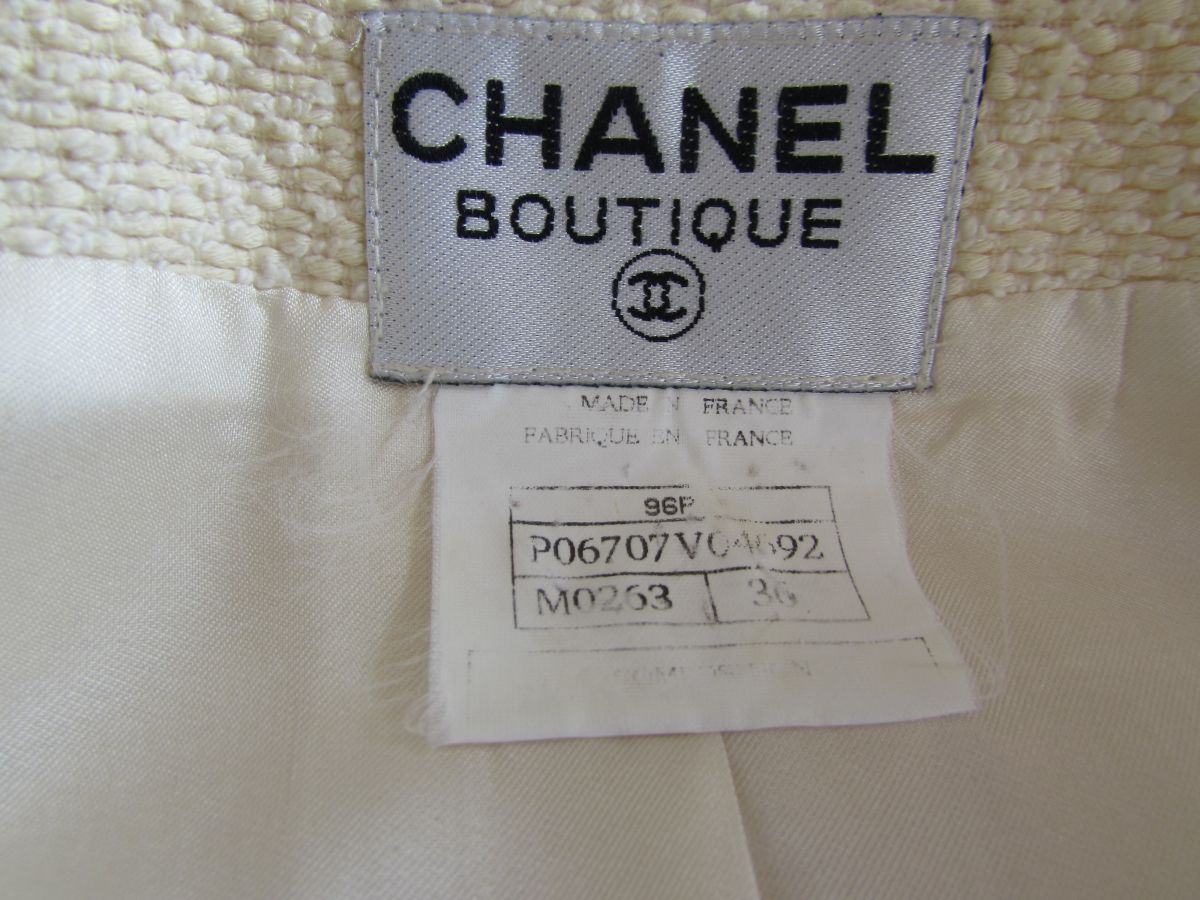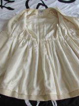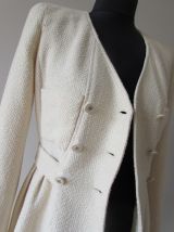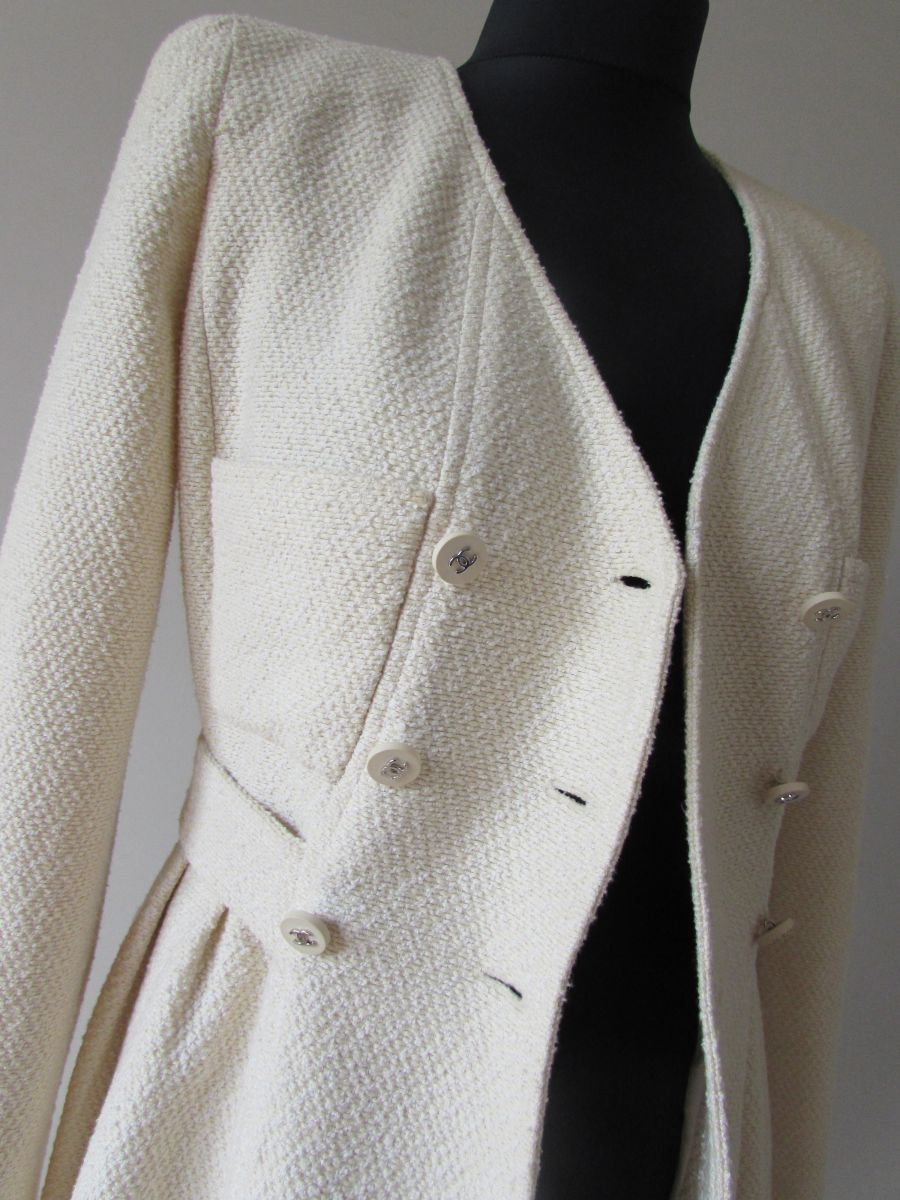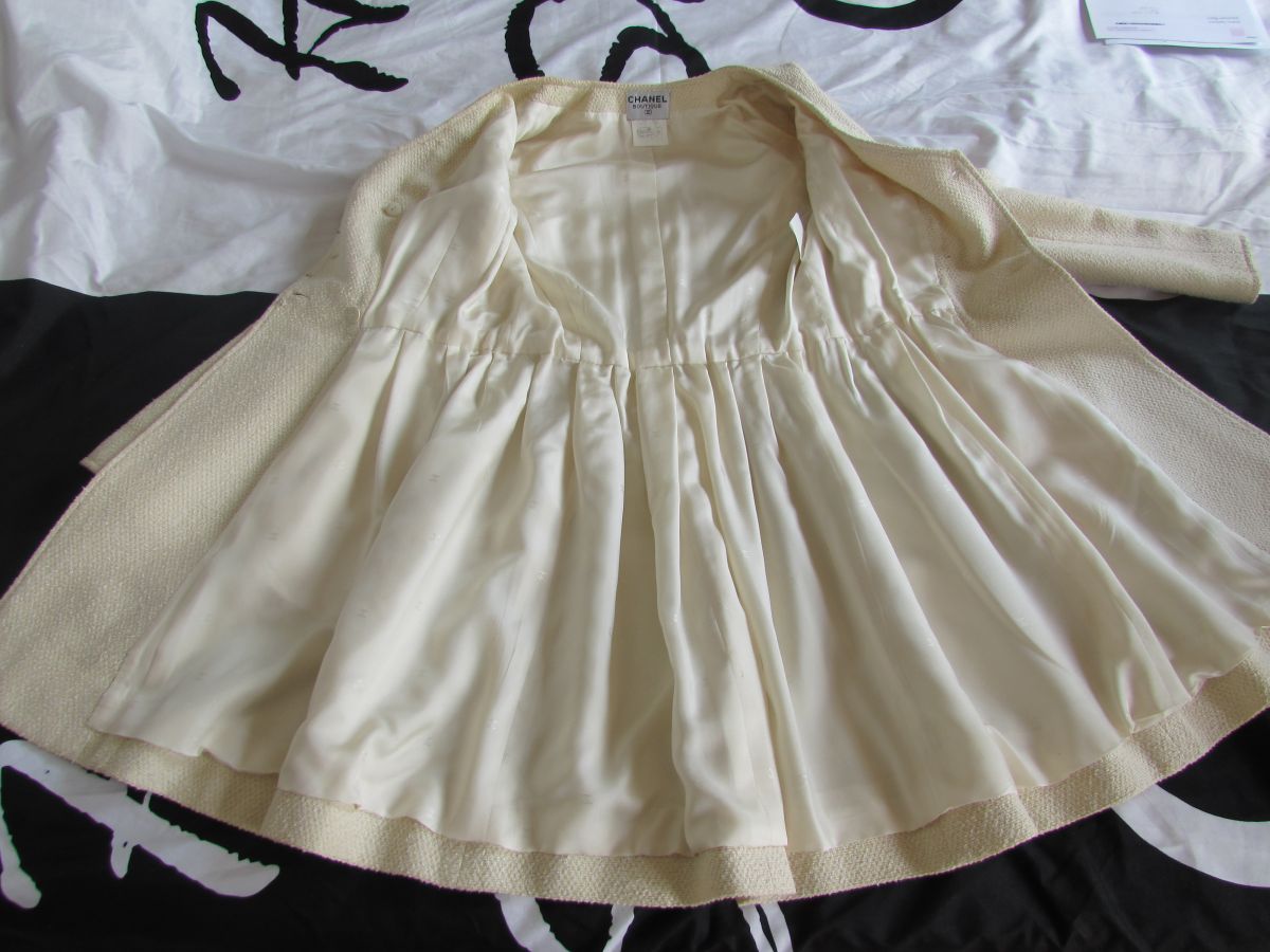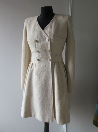 LA PIÈCE CHANEL A AVOIR ABSOLUMENT DANS SON DRESSING !!! Ce SUBLIME Manteau/Robe en tweed beige qui tend légèrement vers le jaune paille; Il est légèrement cintré, avec plissement tout autour de la taille et comporte une ceinture cousue sur le devant et qui se ferme au dos par un bouton siglé avec le double "cc" couleur argent ; (les boutons sont signés sur le dos). 2 vraies poches plaquées de chaque côté et 2 poches devant sur le haut du manteau. Forme croisée, col V, double fermeture sur le devant, avec 6 boutons siglés du logo chanel. Egalement 2 boutons au bas de manche avec fente pour l’ouvrir. La doublure est en 100 % soie et siglée du logo chanel en filigramme. Taille : 36 Fabriqué en France; Dimensions : Longueur des manches : 60 cm Carrure épaule à épaule : 37 cm Longueur totale : 87 cm Largeur aisselle à aisselle : 44 cm Largeur de la taille : 35 cm Composition :60 % coton; 35 % laine ; 5 % polyamide Doublure 100 % soie; C'est une magnifique pièce Vintage qui restera néanmoins toujours intemporelle grâce à sa coupe très féminine, glamour et moderne ! Ps : sera livré dans un sac cartonné noir Chanel ;) Ce manteau est encore en très bel état pour une pièce vintage, aucune tâche ou trace, juste à noter une très légère auréole sur la doublure à l'intérieur de la manche droite, donc ne se voit absolument pas à l'extérieur.