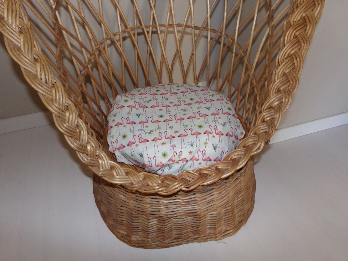 Voici ce joli fauteuil en osier, au tressage et à l'assise robustes, qui trouvera sûrement une place dans votre intérieur. Il est agrémenté d'un petit coussin confortable au motifs flamants roses . H81 x L83 x P62