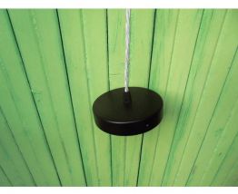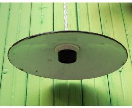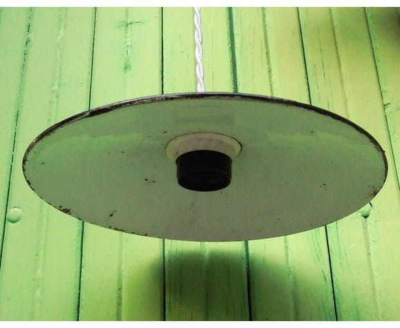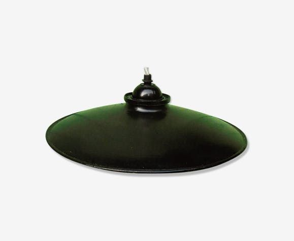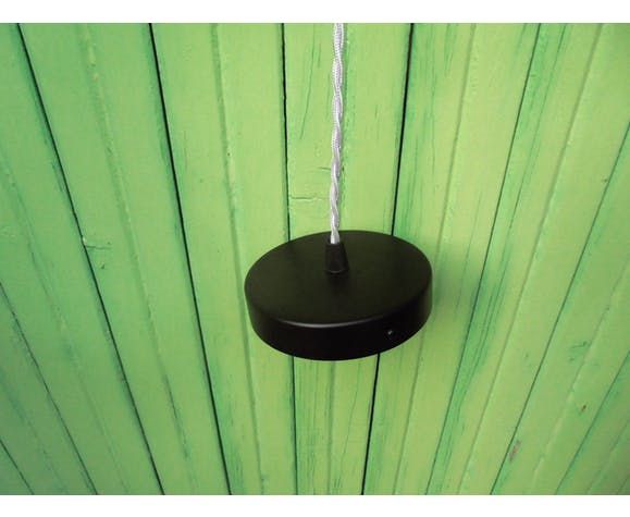 suspension des années 60 en tole émaillée noir satiné réflecteur blanc avec les marques du temps partie electrique ' douille rosace et fil gainé coton gris argent neuf.