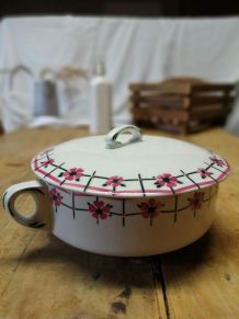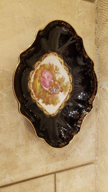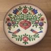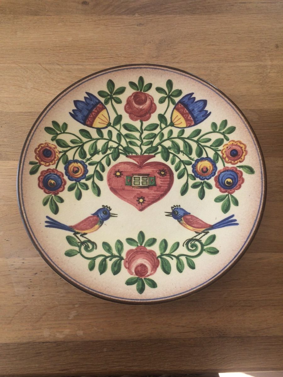 Grand plat peint à la main, à décor polychrome d'oiseaux, fleurs et rinceaux feuillagés.