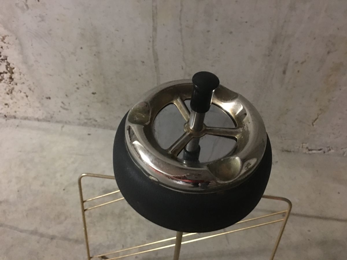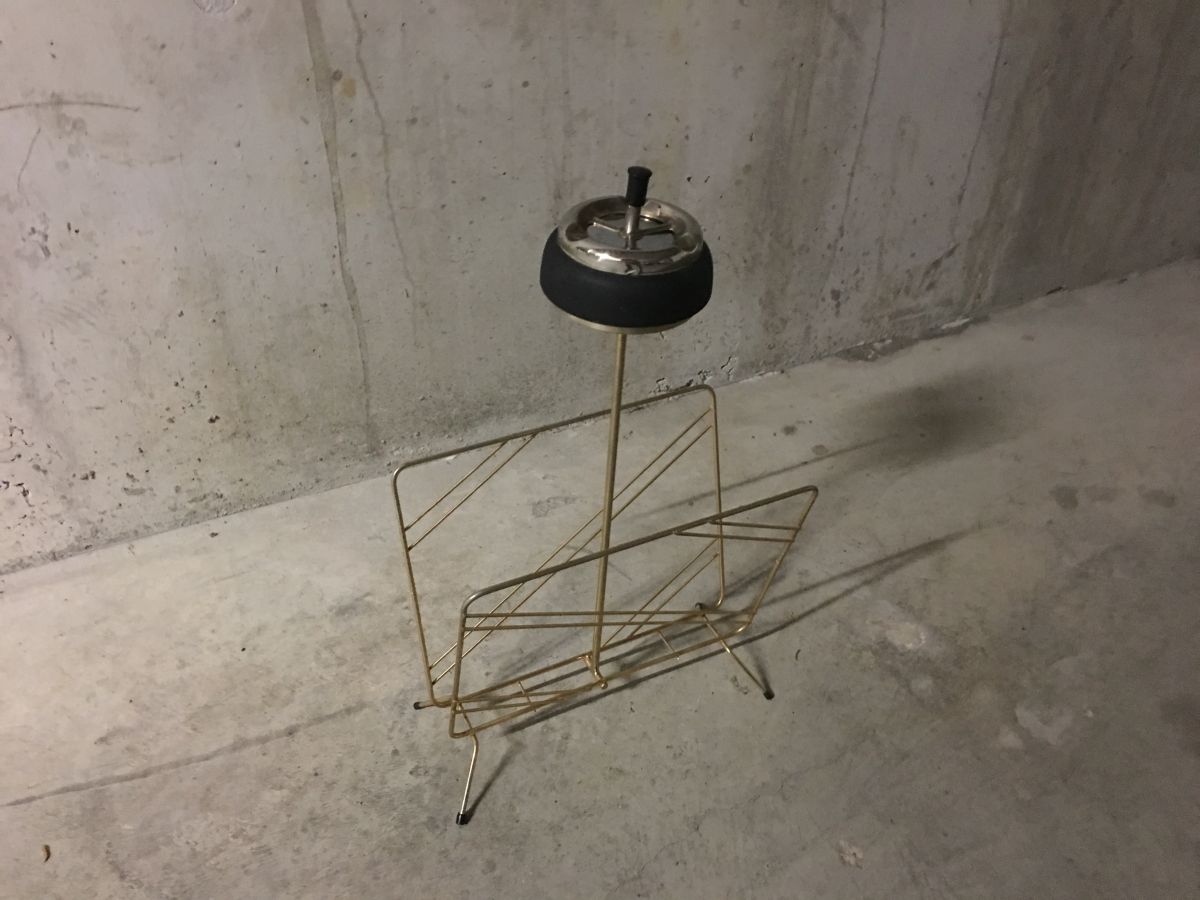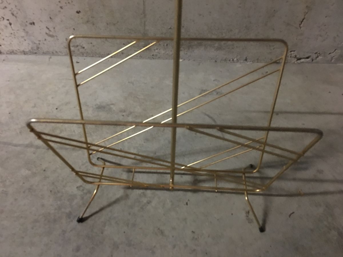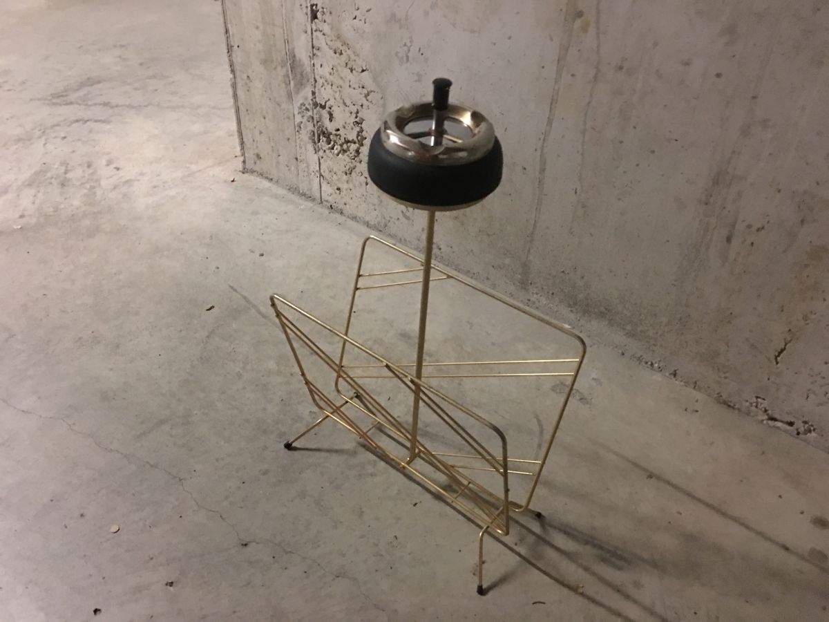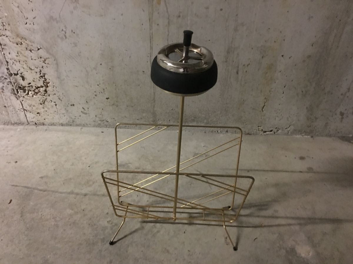 Porte-revues cendrier des années 50 en métal doré, quelques manques de dorure due à un usage normal, dimensions (cm) : L.34xH.58xP.18, bon état.