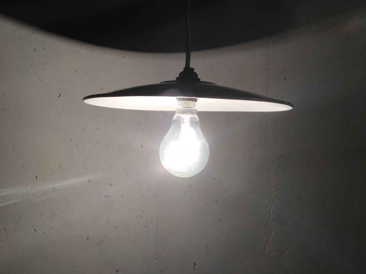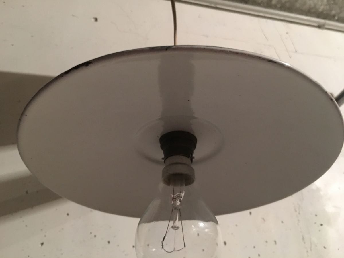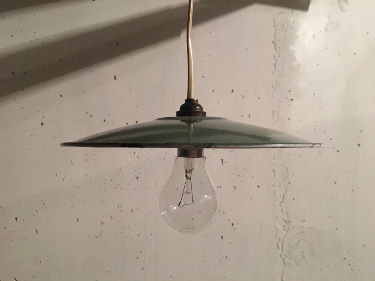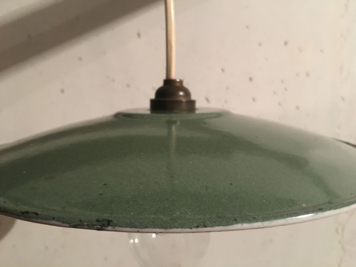 Suspension gamelle industrielle des années 50 en tôle émaillée vert clair, quelques infimes éclats (voir photos) qui contribuent au vécu et au charme de la lampe, parfait état de marche, hauteur 3cm, diamètre 24cm, douille en laiton, fil électrique changé, bon état.