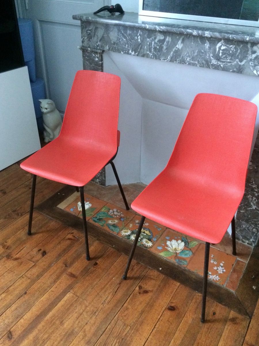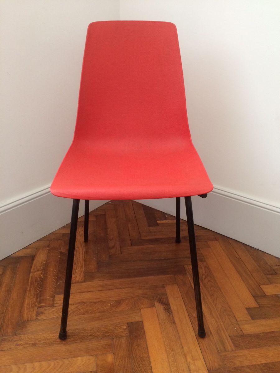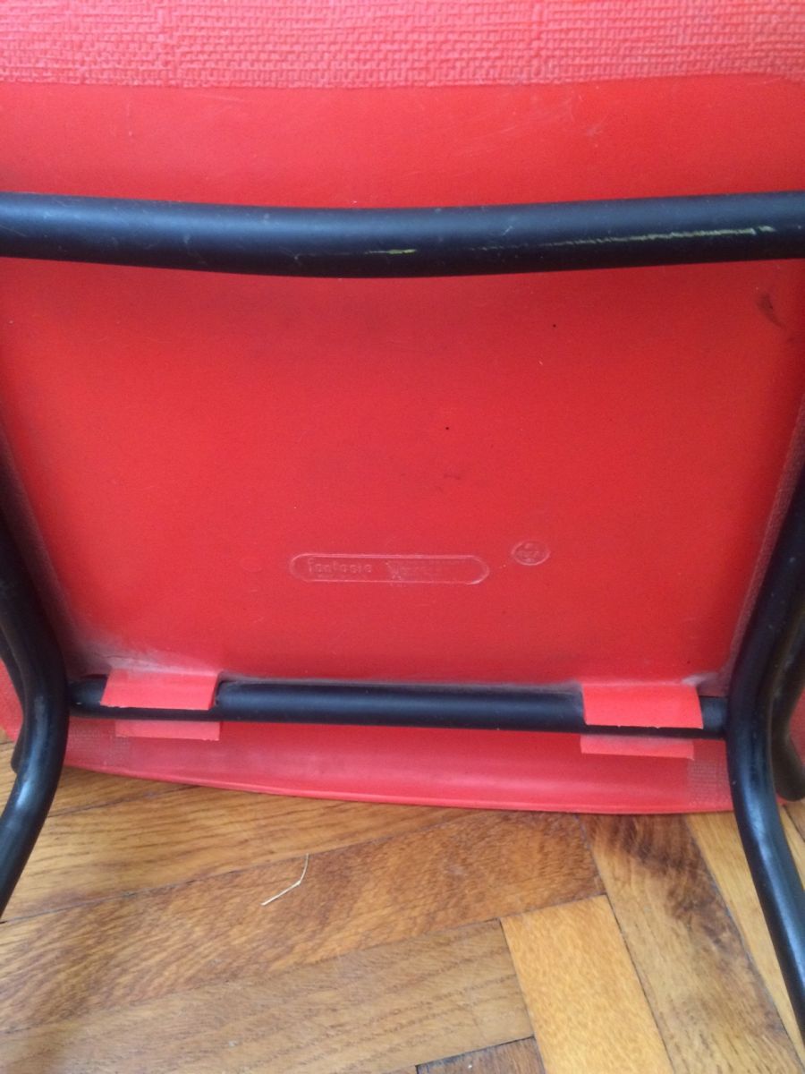 Chaises éditées par Fantasia, estampille présente, dite "incassable". Joli rouge avec léger relief impression de tissage. Pieds laqués noir. Excellent état. Sobre et élégante !