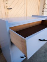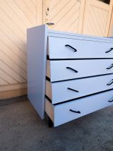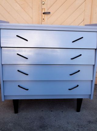Charmante commode avec 4 tiroirs. Elle a été peinte avec la référence " Lune Cendrée " ( tournant vers le mauve ) de chez Dulux Valentine et un noir satin provenant de la même marque pour les pieds. Le tout est en très bon état, le côté des tiroirs sont stratifiés transparents pour éviter tout choc et éclat de peinture.