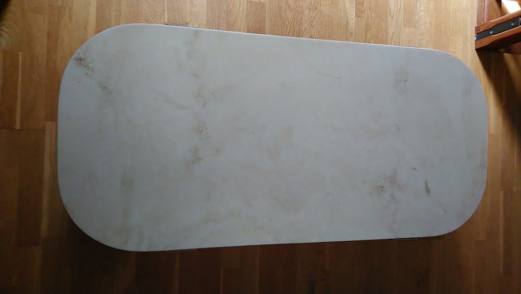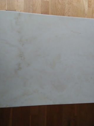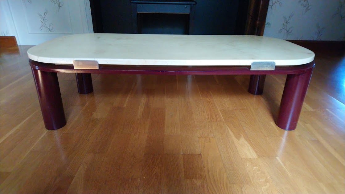 Plateau en marbre-travertin, support et pieds métalliques couleur grenat.