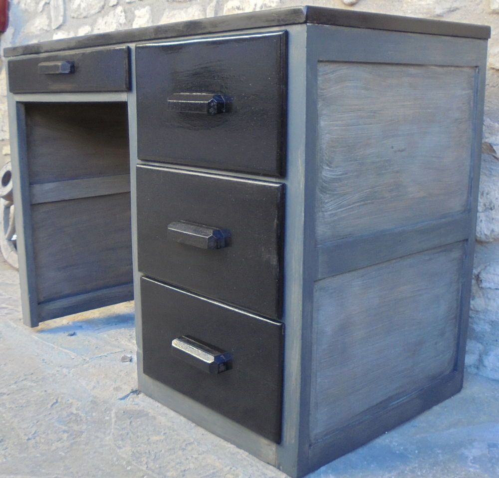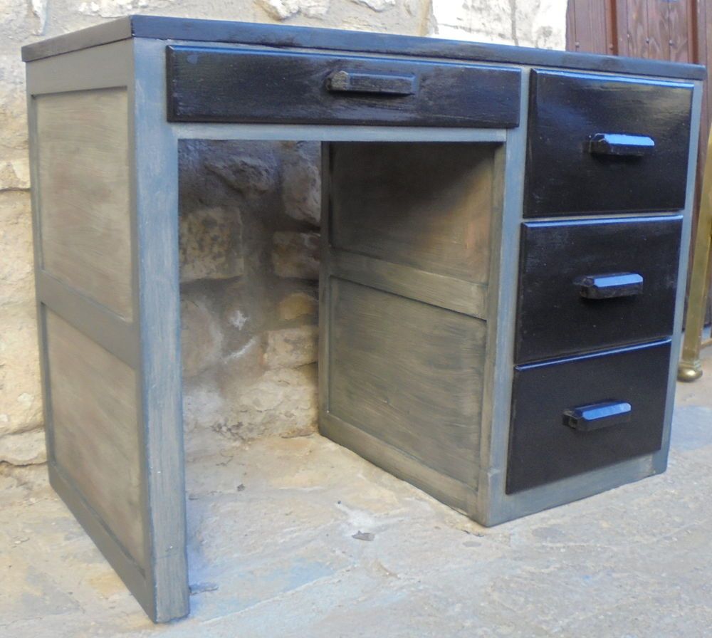 Bureau années 60 avec 3 tiroirs profonds côté droit et un tiroir plat. Plateau d'origine ciré, structure patinée grise et tiroirs et bande de côté noir satiné. fabrication locale par menuisier solide et stable 100 x60 x75 de haut