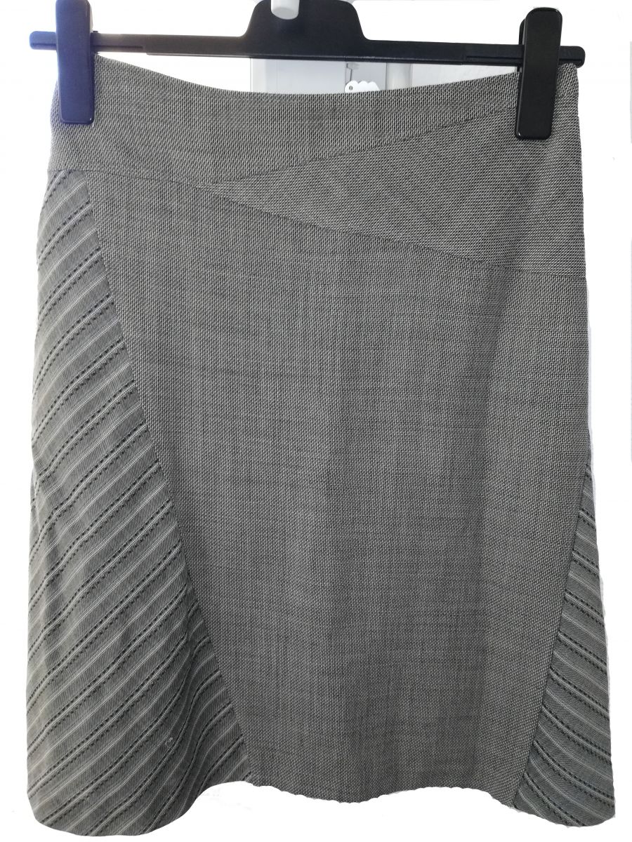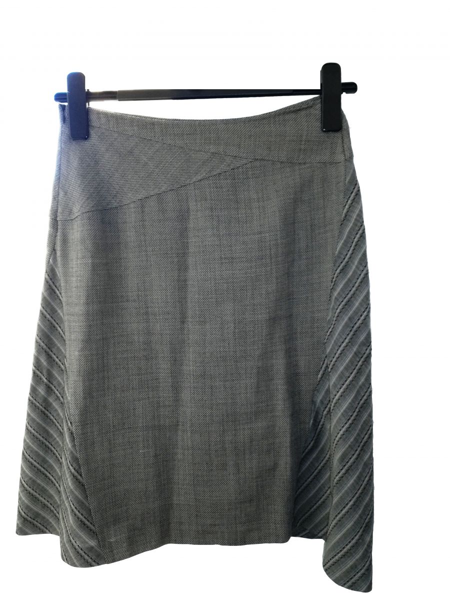 L'extérieur de la jupe est en 100% laine dans les tons gris et quelques lignes bleues discrètes sont ajoutées au niveau des rayures.