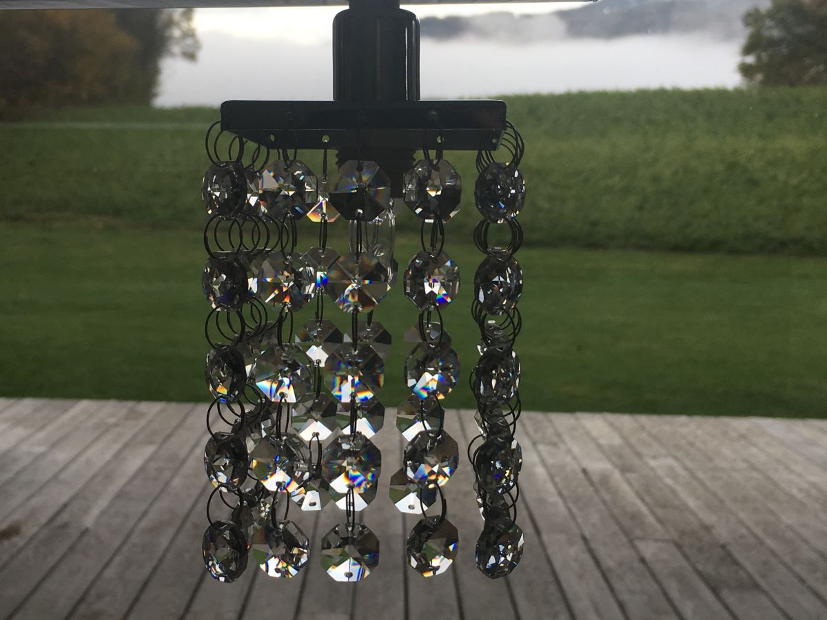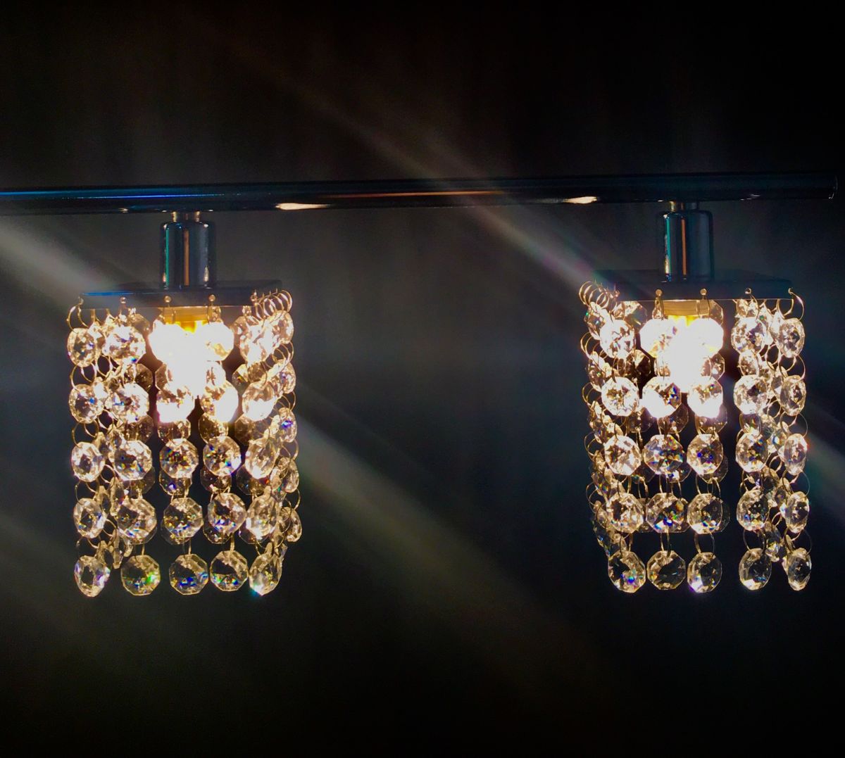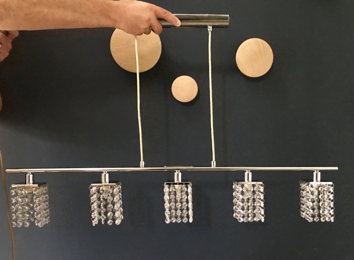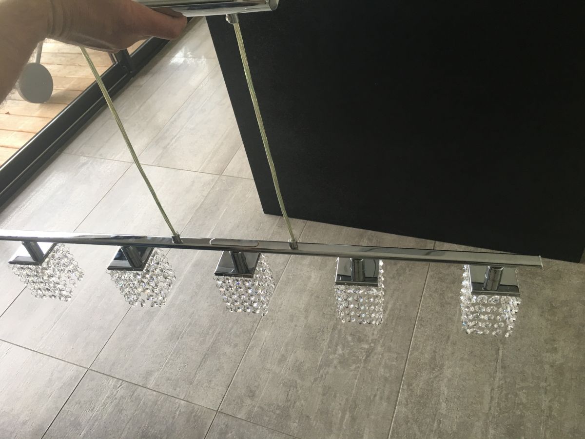 Composé de 5 petites suspensions halogènes - les pampille facettées renvoient de magnifiques reflets. Idéal au-dessus d’une tablette ou salon. voir croquis pour détails dimensions. À négocier