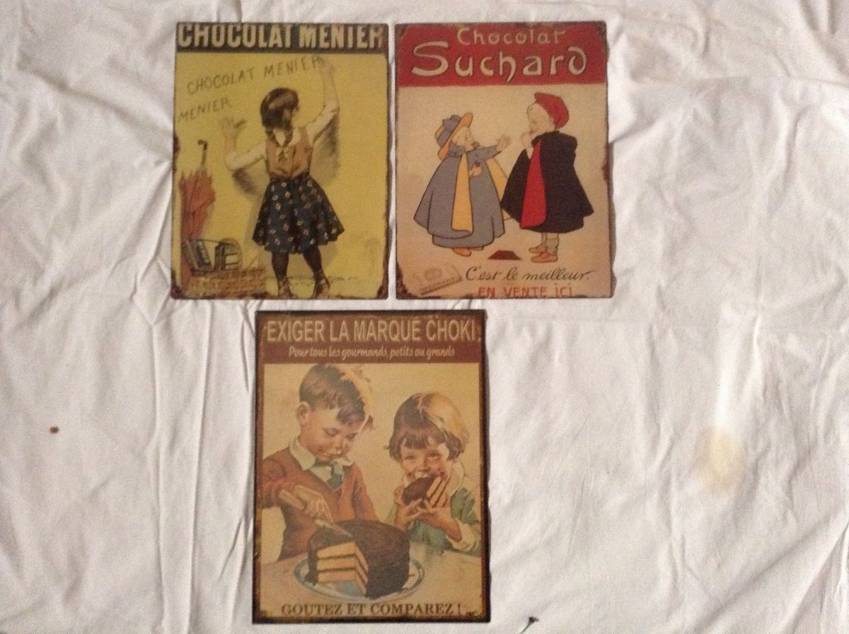 lot de 3 affiches publicitaire en metal. dimensions 35x26 et 33x25 et 33x25