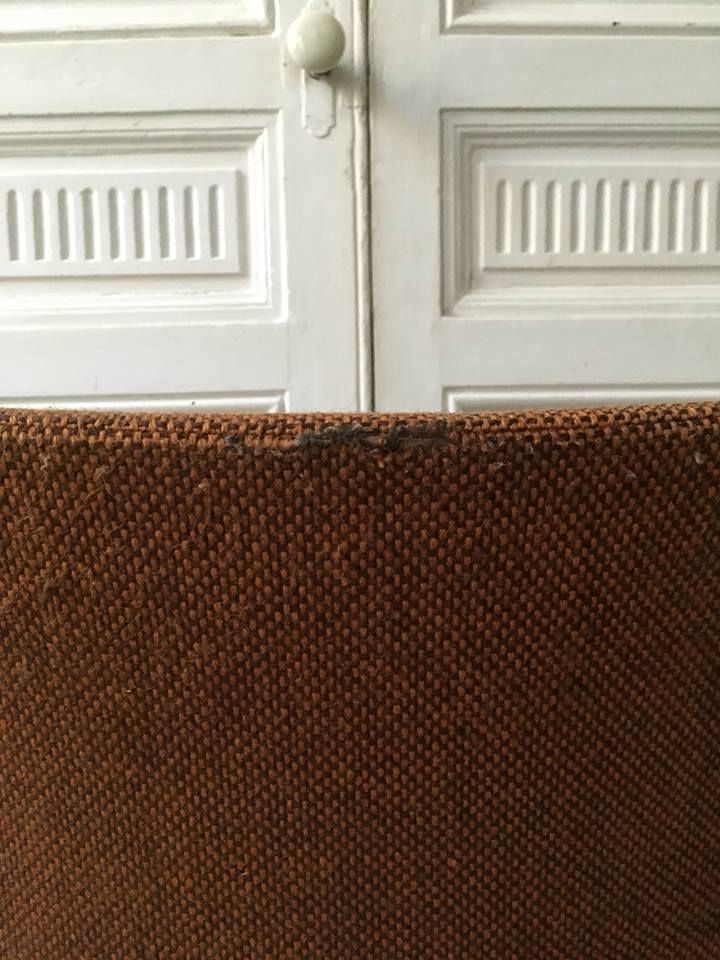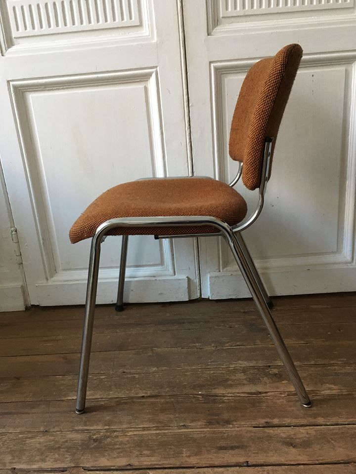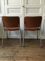 Paire de chaises des années 60 - 70 en bon état de conservation ( hormis usure modérée au niveau de la face postérieure du dossier de l'une des 2 chaises , voir photo). La chaise possède une structure en métal chromé, une assise ( H45cm ) et un dossier moelleux ( confort assuré ! ), recouvert d'un tweed orangé brun ( couleur fidèle aux photos). Design et Belles ligne intemporelle! Ideal dans votre chambre, votre bureau, autour d'une table... Piece vintage solide, stable lettres confortable! 120e la paire ( hauteur assise 46cm).