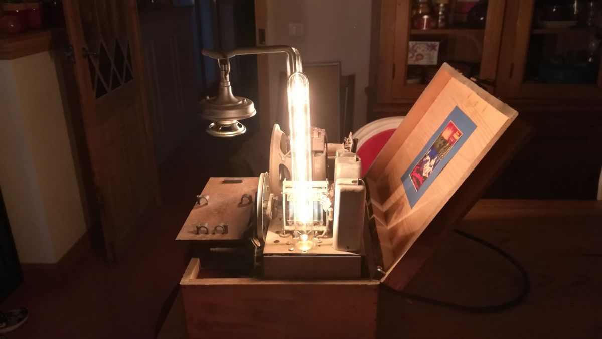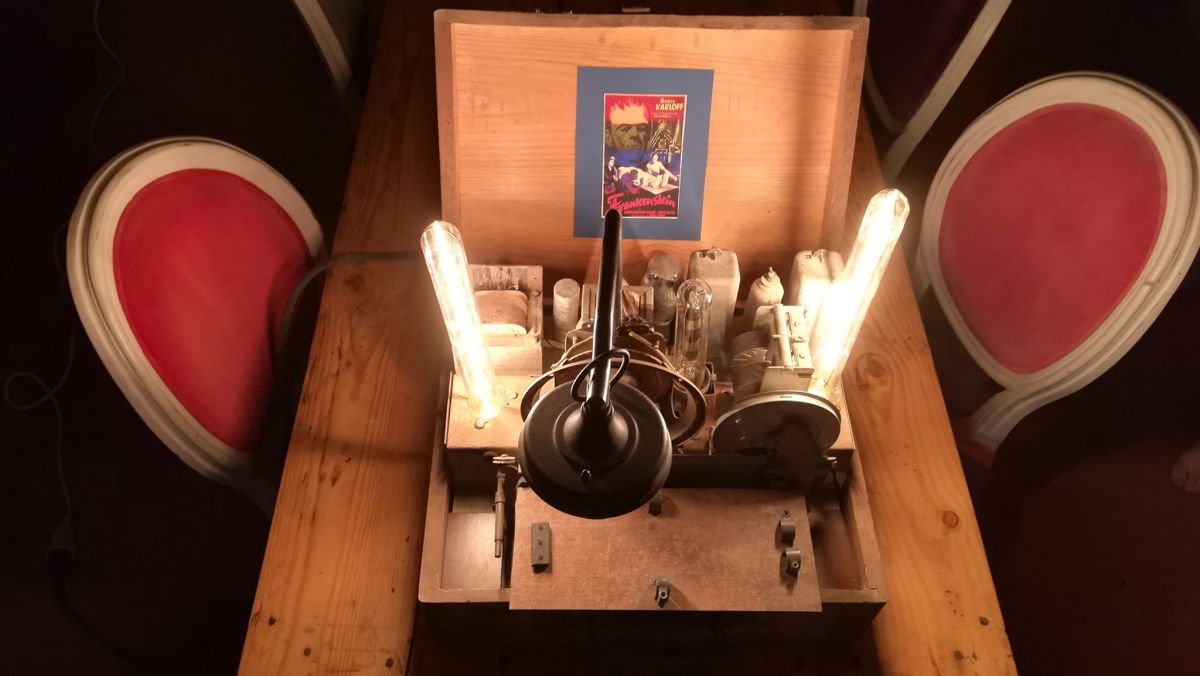 Lampe à poser représentant le laboratoire de Frankenstein. En bois et métal. Longueur 45 cm , largeur 40 cm, hauteur 45 cm.