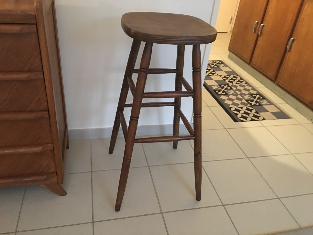 Très beau tabouret de bar des années 50 en bois massif, entièrement reponcé et reverni, pieds compas et travaillés, superbe patine, hauteur 78cm, diamètre assise 34x34cm, bon état.