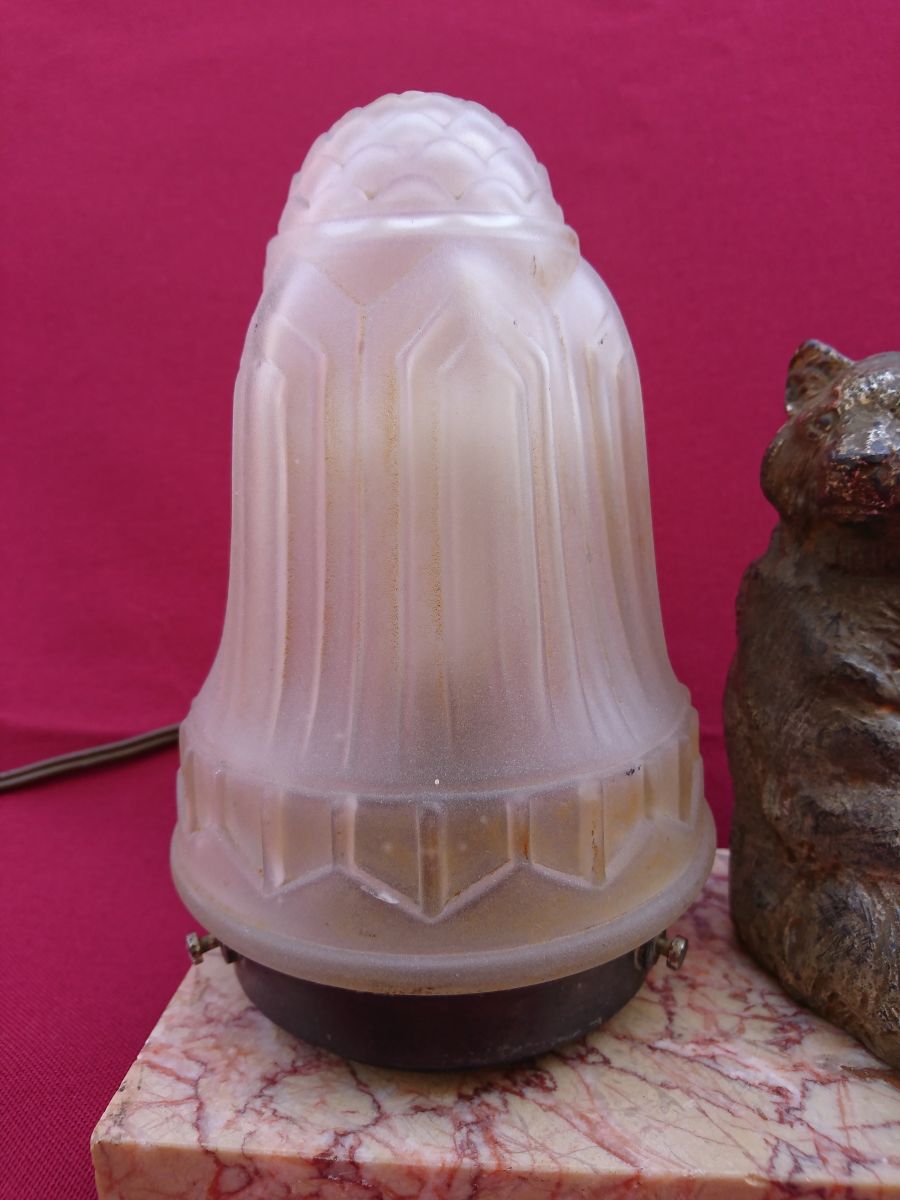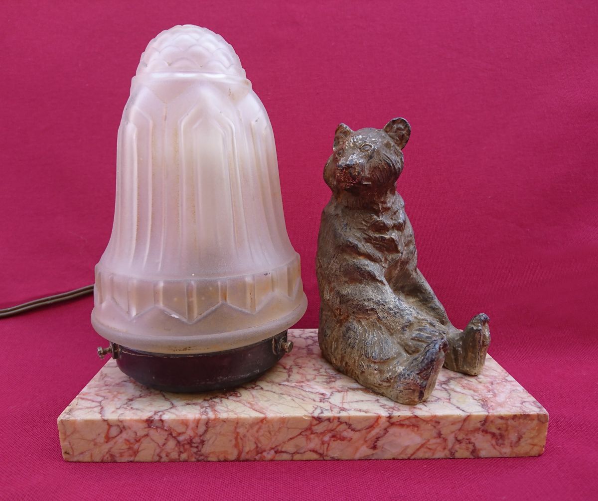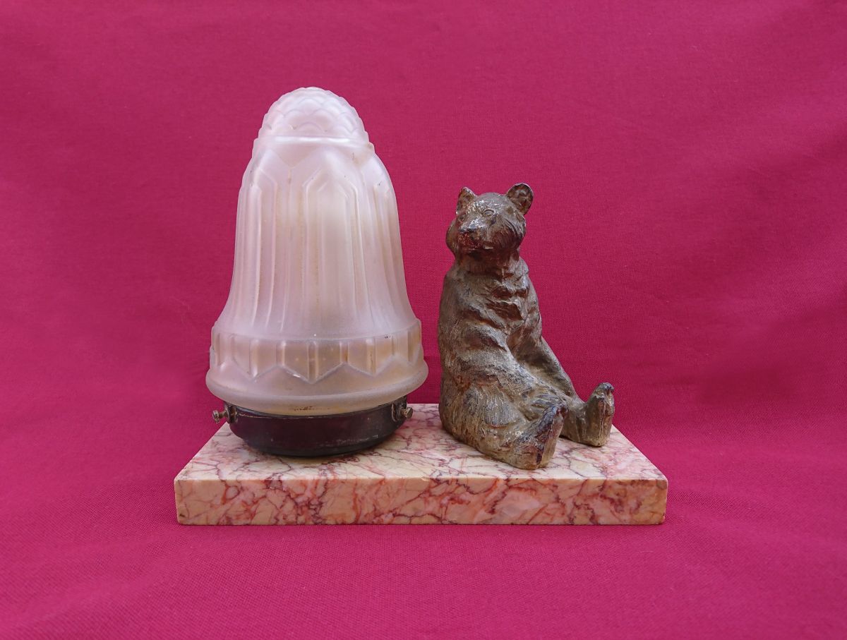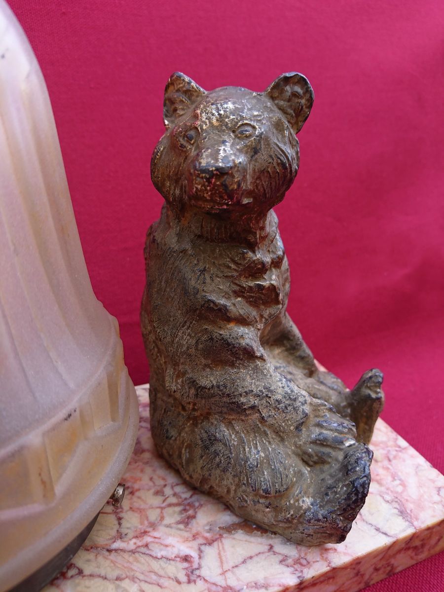 Élégante lampe de table / Veilleuse Art Deco avec socle en marbre et un ours assis. Bel abat-jour en verre satiné moulé, ours en régule patiné bronze, brun légèrement doré.