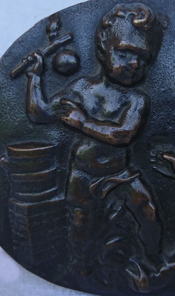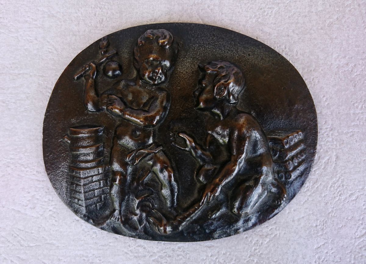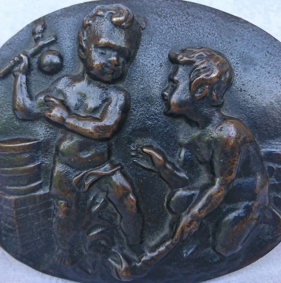 Bas relief sculpté en bronze représentant une scène de forge avec deux angelots, dans le gout de Clodion.