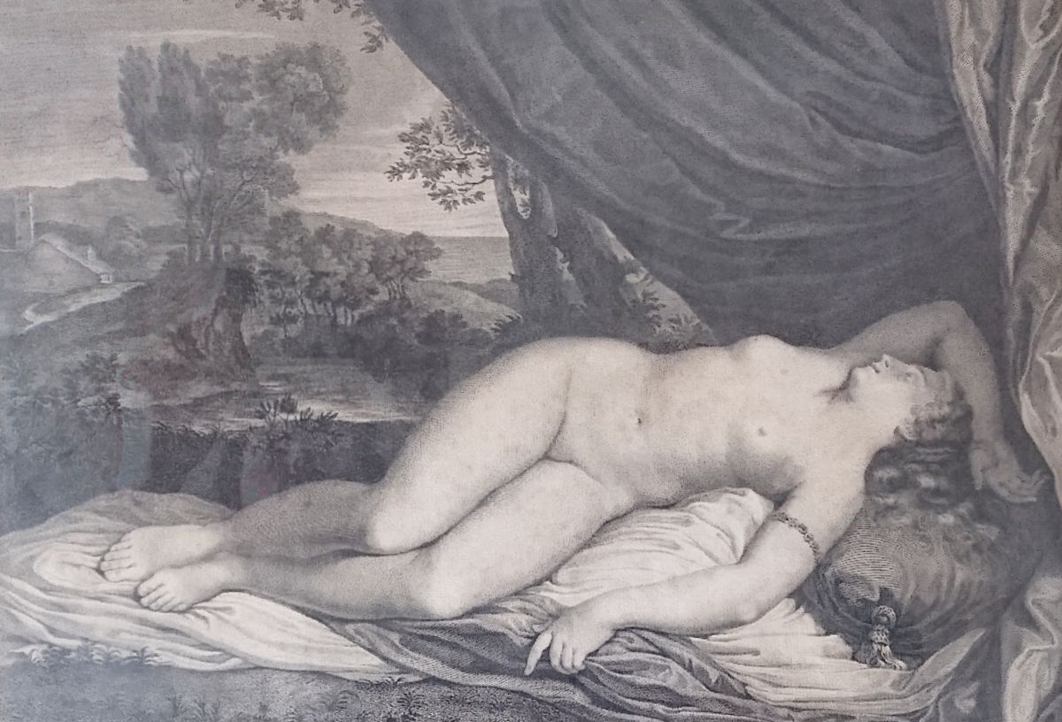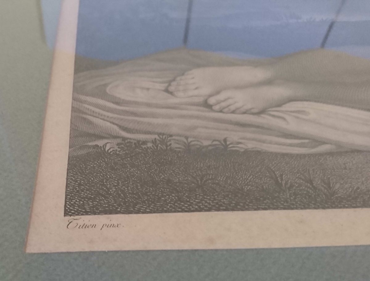 Le Sommeil. Titien pinx. / Romanet sculp.". Avec adresse: "A Amsterdam chez LBCoclers Peintre Md. de Tableaux Estampes et Dessins, Colsvenirs Burgwal n ° 10. Et à Paris chez Citoyen Desmarest Rue Montmartre près de la Cour Mandar, n ° 247"