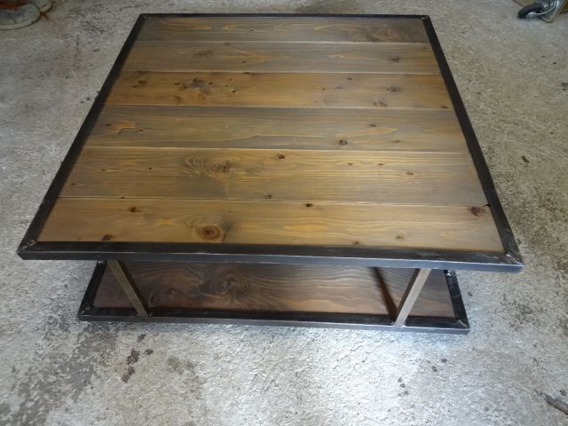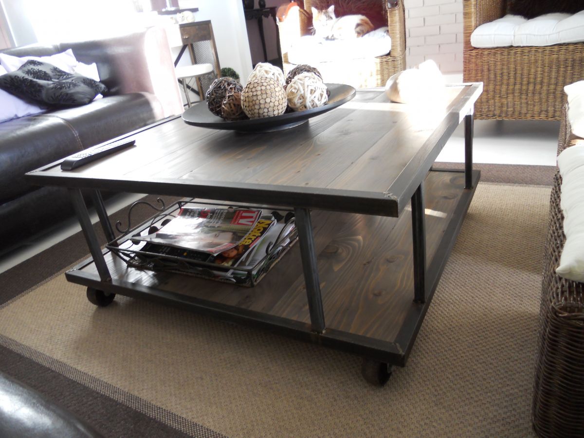 table basse style industriel 90cm x90cm h 35cm sur roulettes , le fer à reçu une protection anticorrosion, le bois est du cèdre teinté et protégé par un vitrifiacteur mat.
