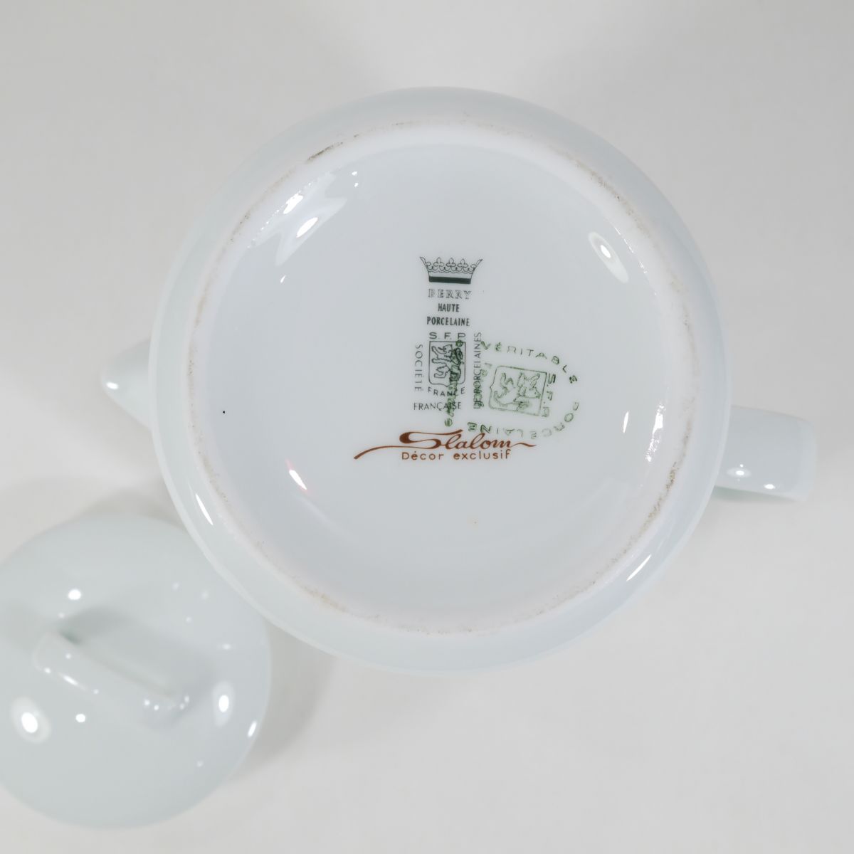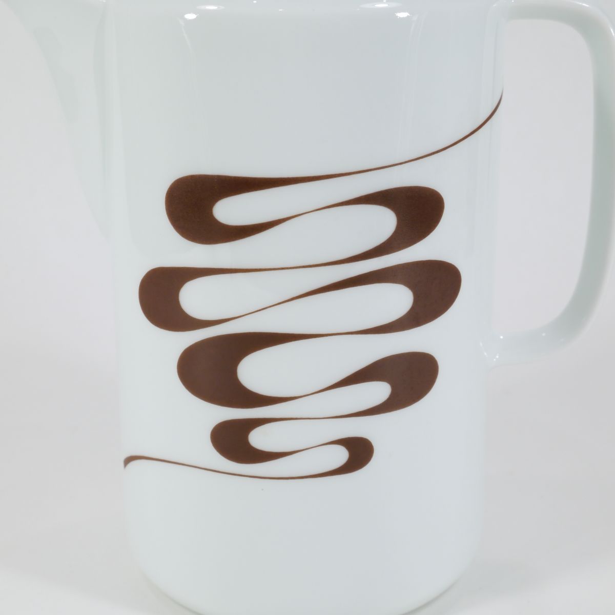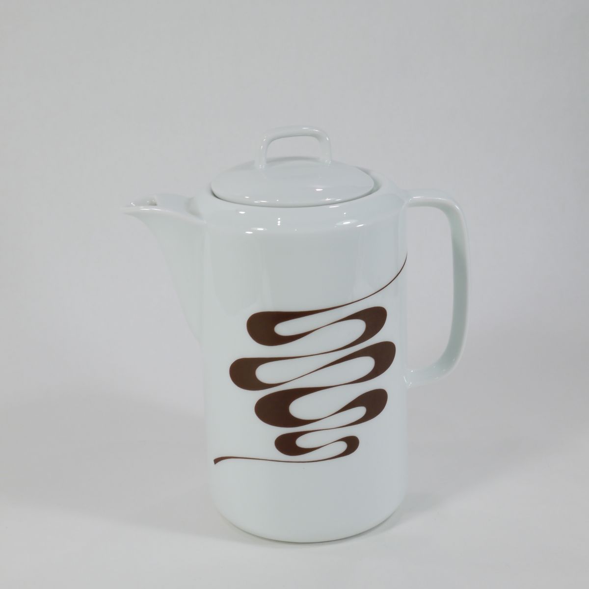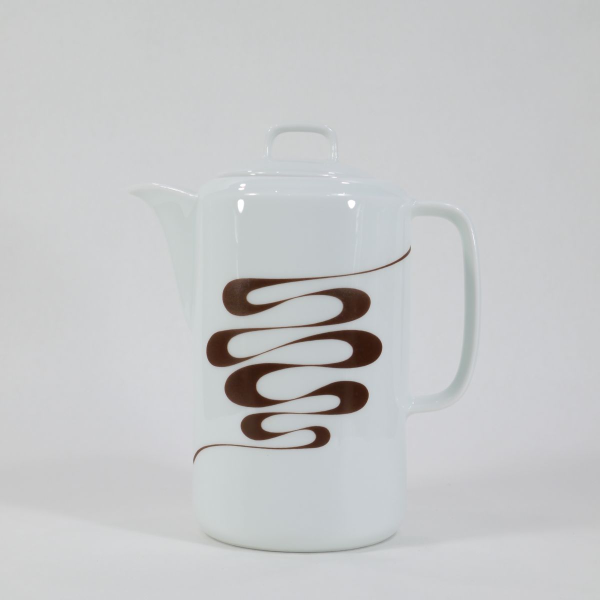 Cafetière 70s en porcelaine du Berry, au décor "slalom", à la fois sobre et vintage. Très bon état. Nous vendons également un sucrier ainsi qu'un saladier avec le même motif.
