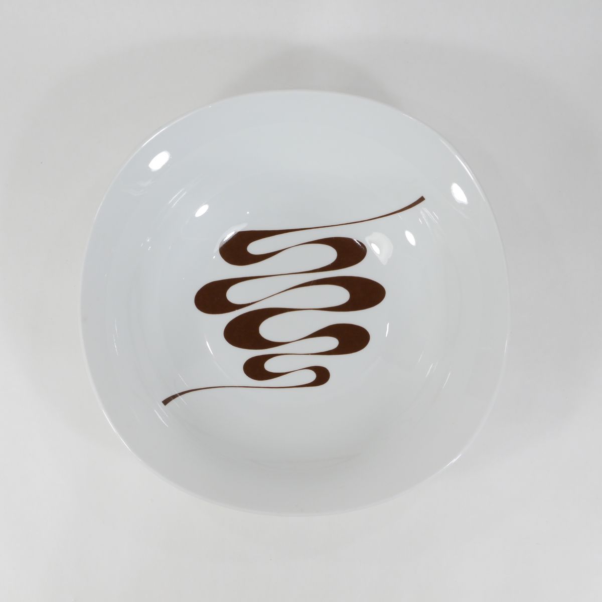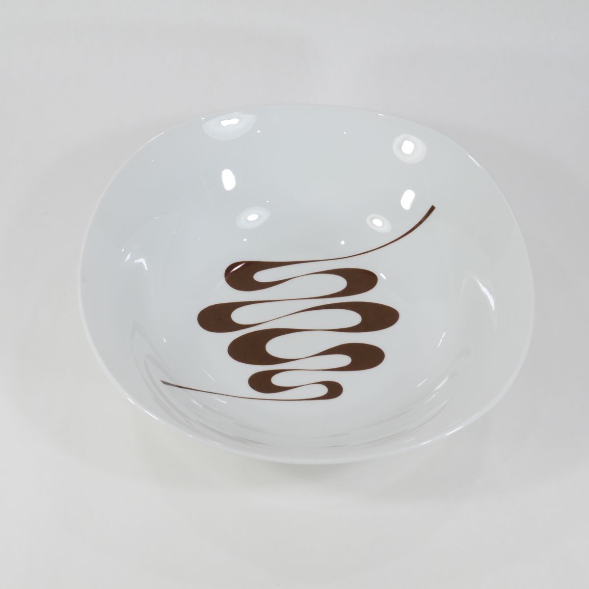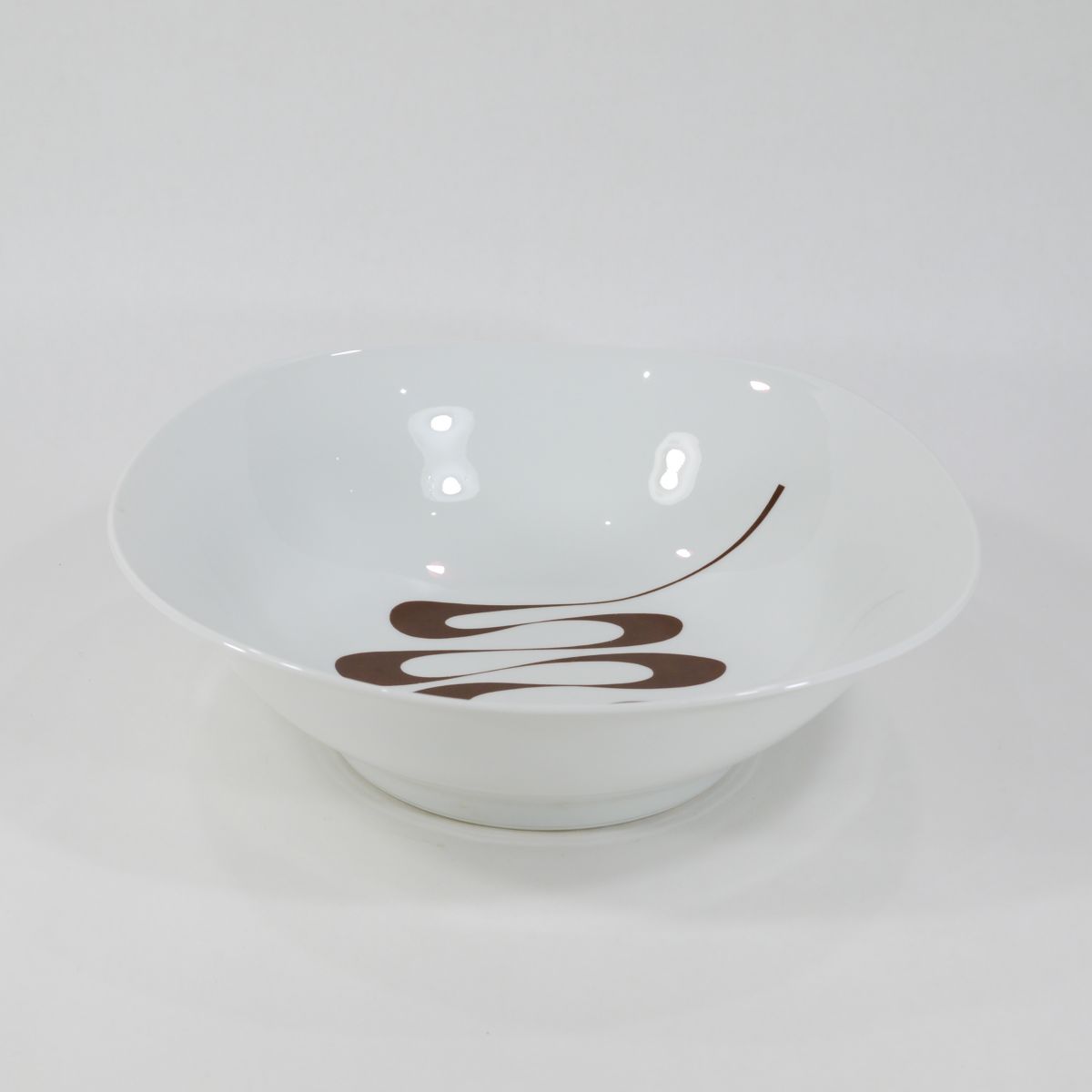 Saladier 70s en porcelaine du Berry, au décor "slalom", à la fois sobre et vintage. Très bon état. Nous vendons également une cafetière et un sucrier avec le même motif.