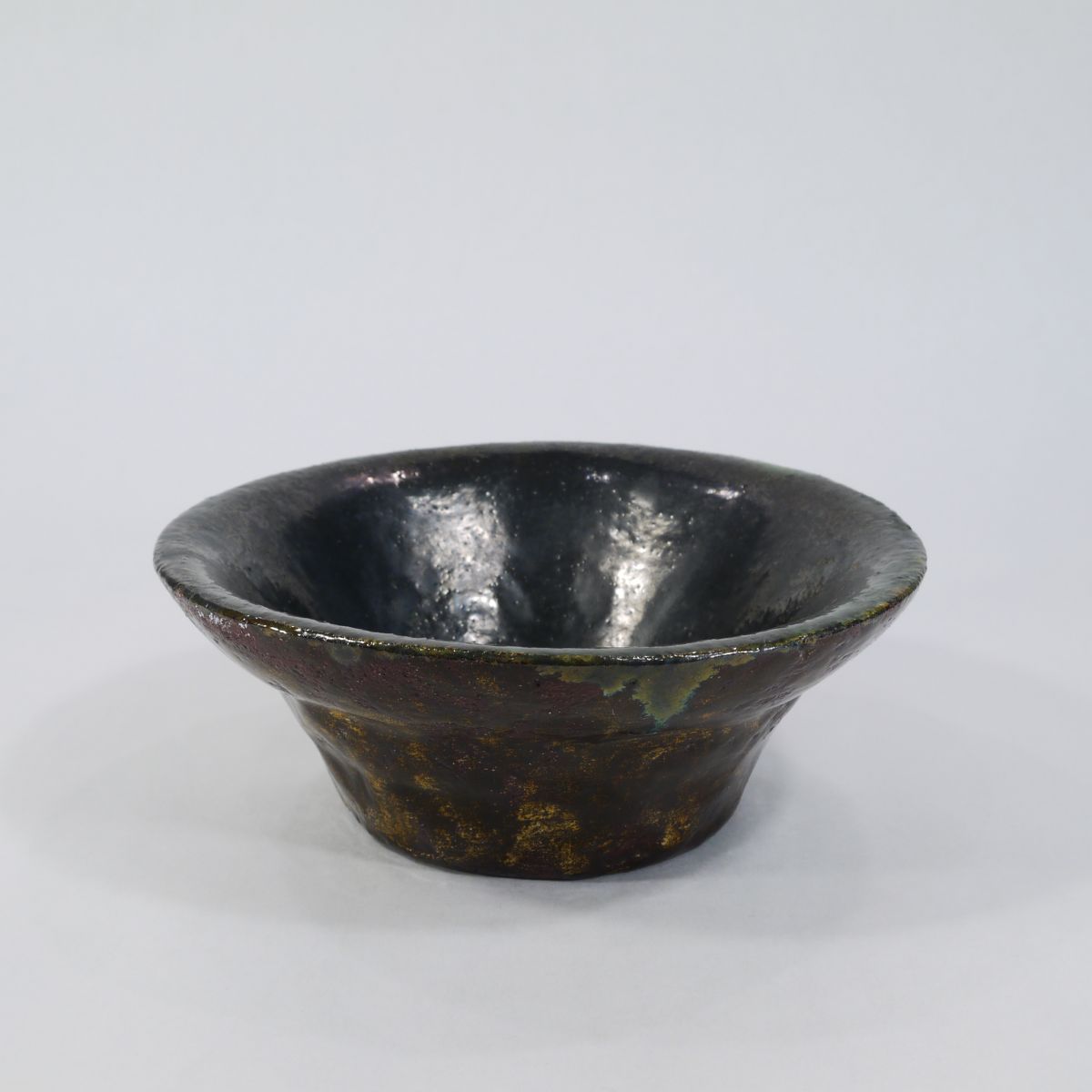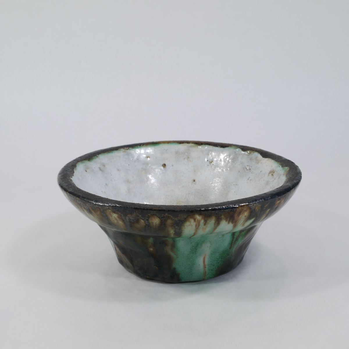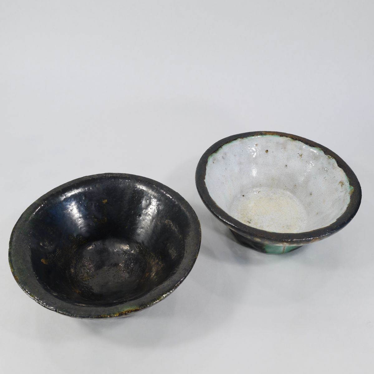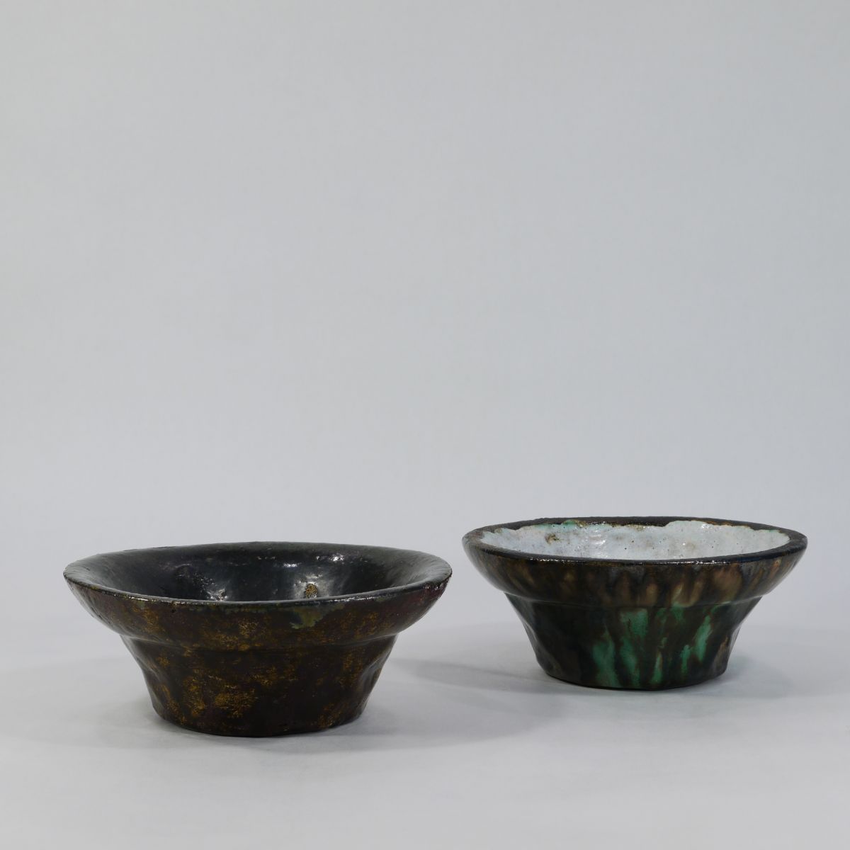 Paire de grands bols faits à la main, vraisemblablement dans un moule mais finis et émaillées artisanalement. L’un à l’intérieur noir et l’extérieur noir et marron, l’autre à l’intérieur blanc et l’extérieur noir/marron/vert d’eau. Idéaux pour une déco vintage/brute.