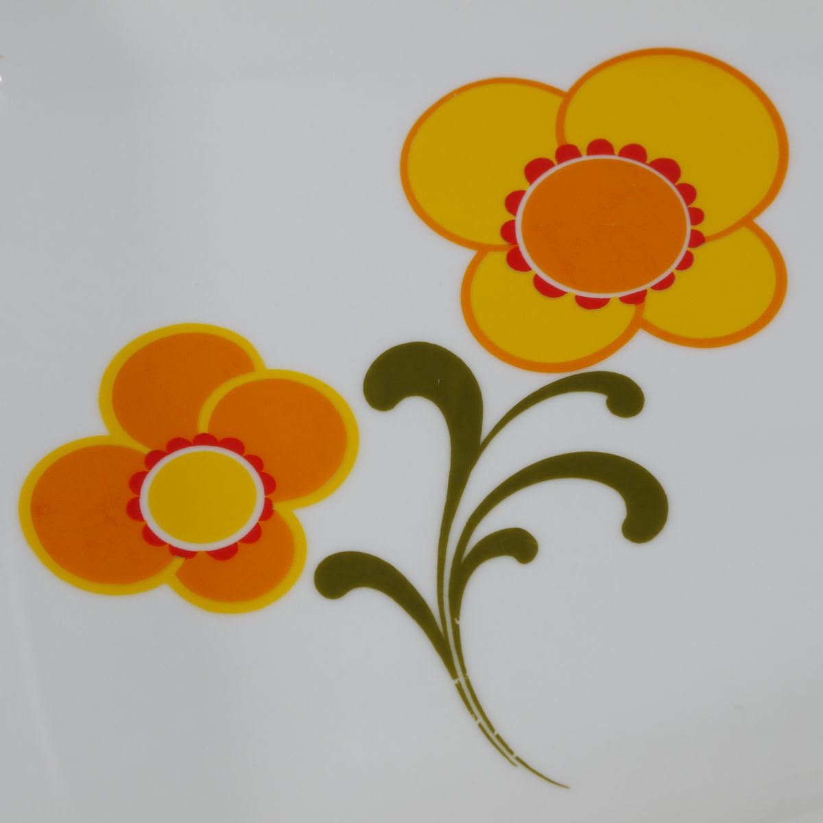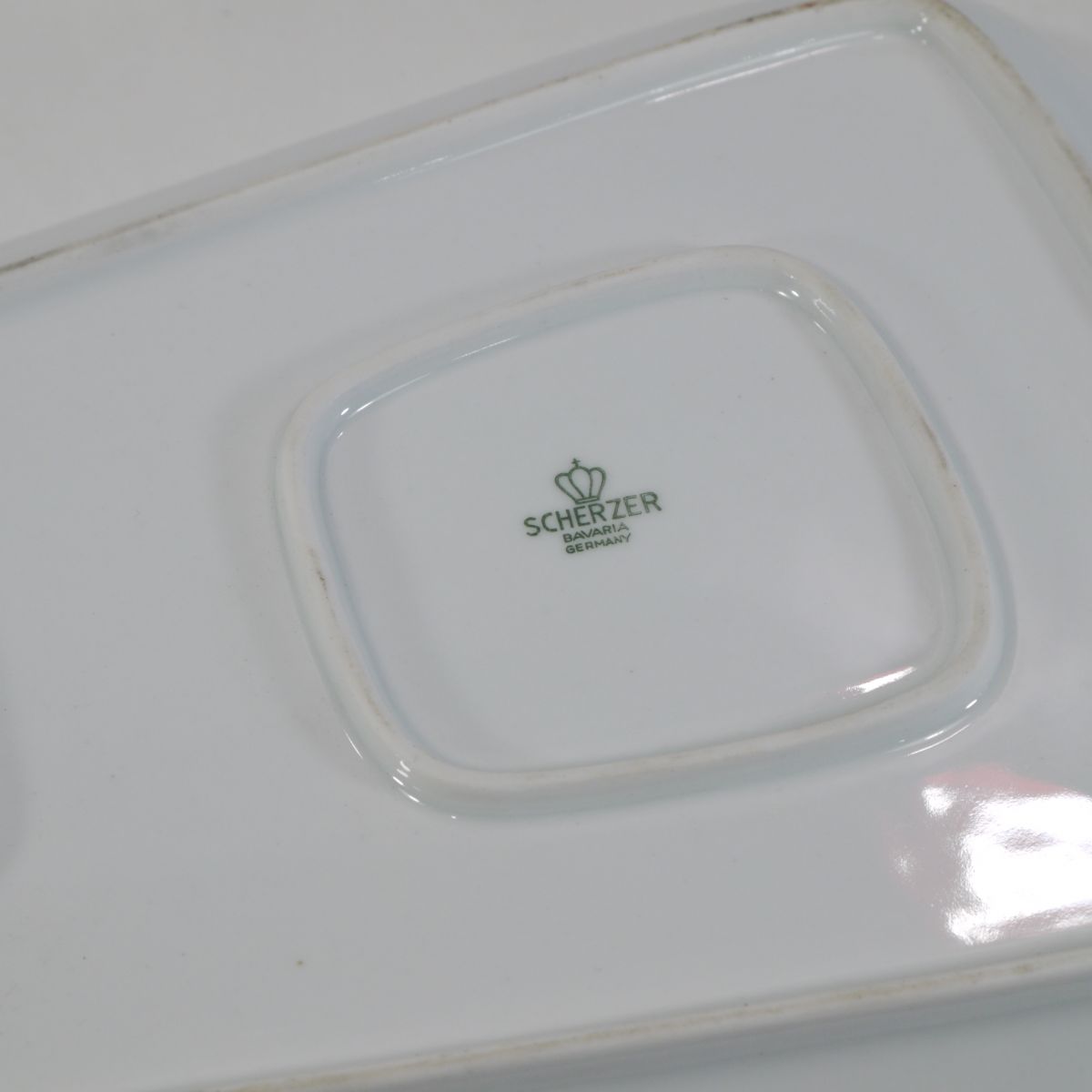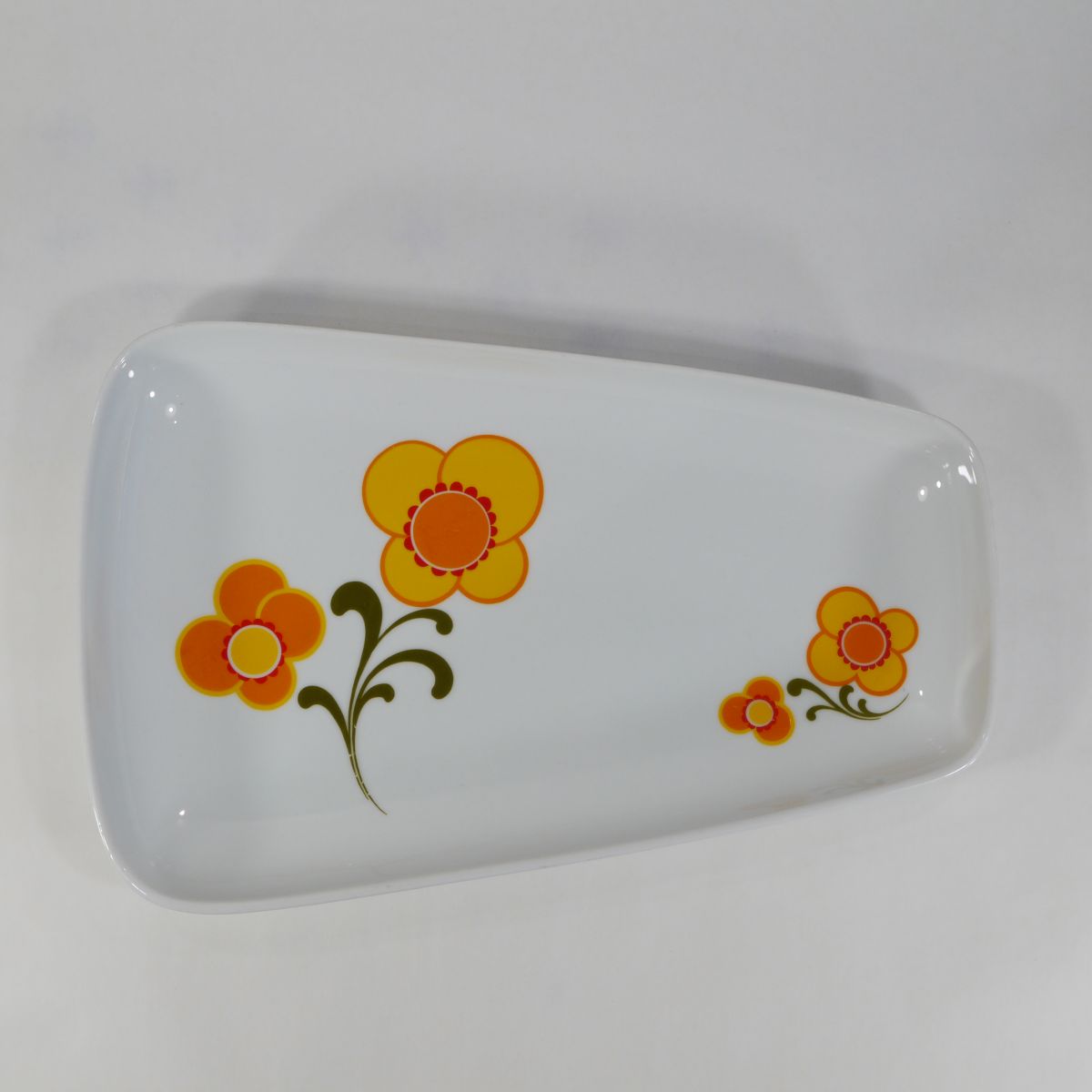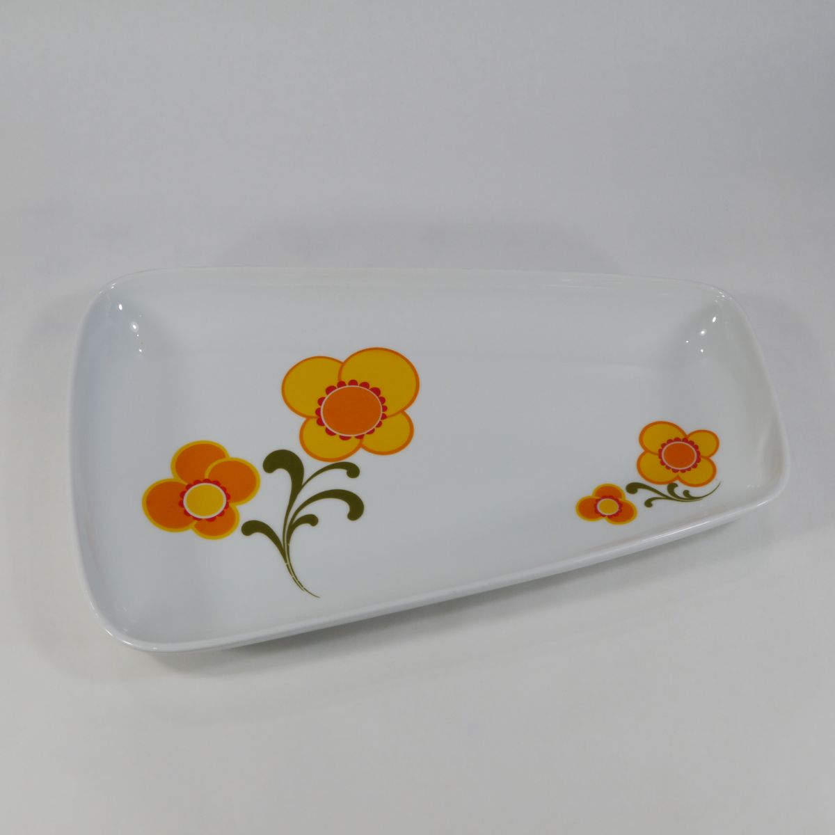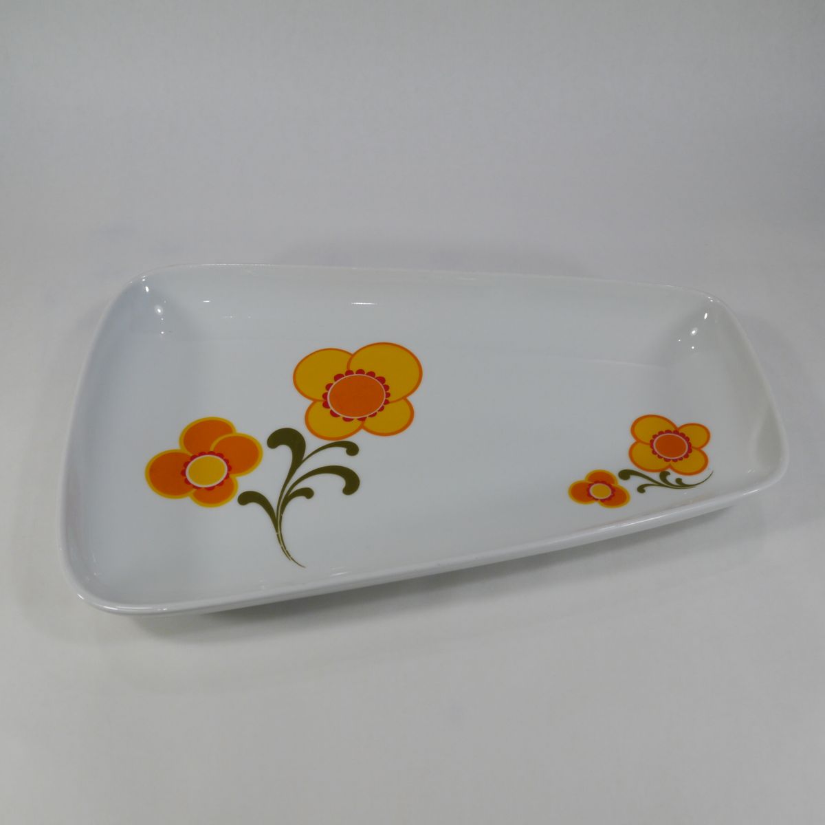 Plat légèrement creux de forme originale (en trapèze arrondi), à décor fleuri typique 70s. En porcelaine de Bavière, fabrique Sherzer. Bon état, traces d’usage légères.