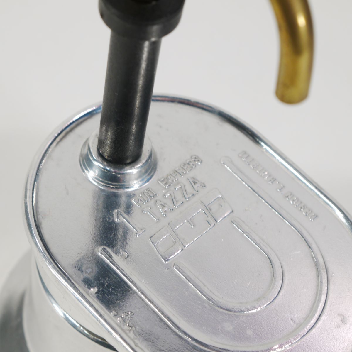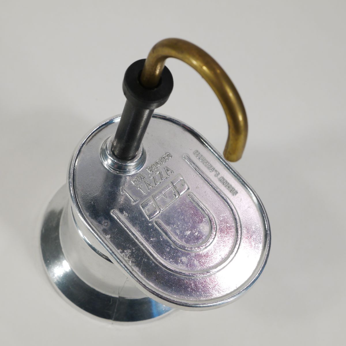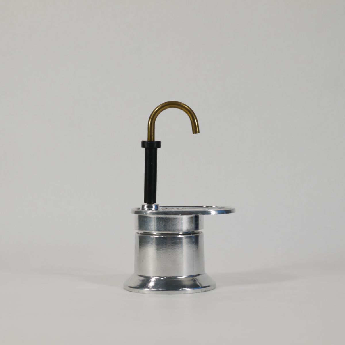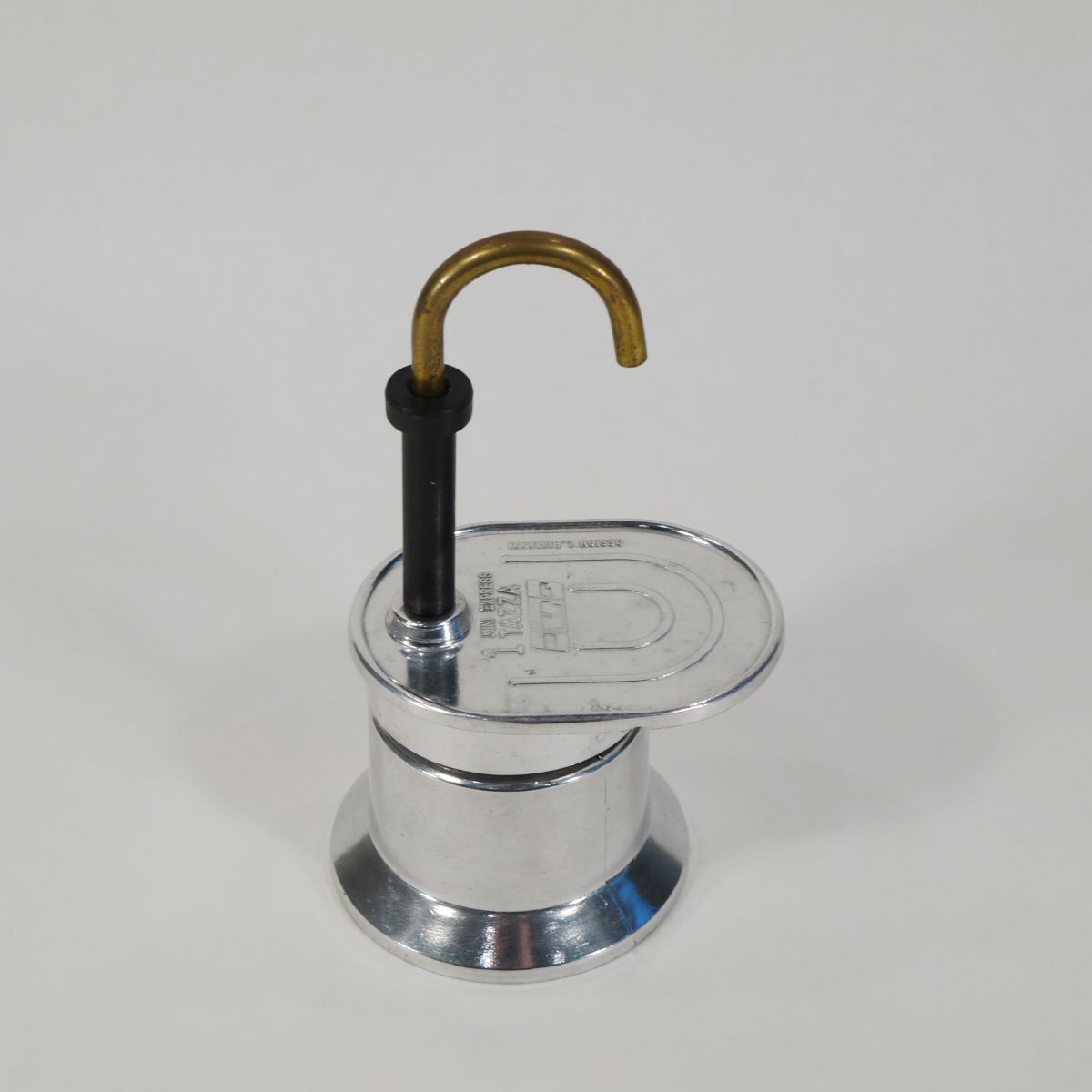 Cafetière expresso individuelle, de marque Bialetti, pour une petite tasse. Etat neuf (il y a encore le mode d’emploi plié à l’intérieur). En aluminium et laiton.