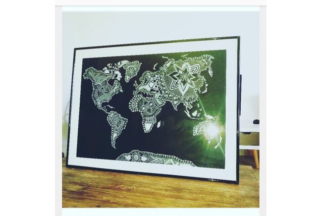 Cette carte du monde mandala est réalisée au crayon blanc sur feuille noire et signée par mes soins.