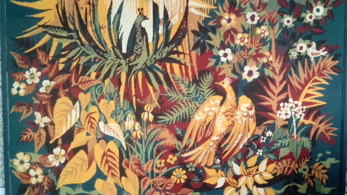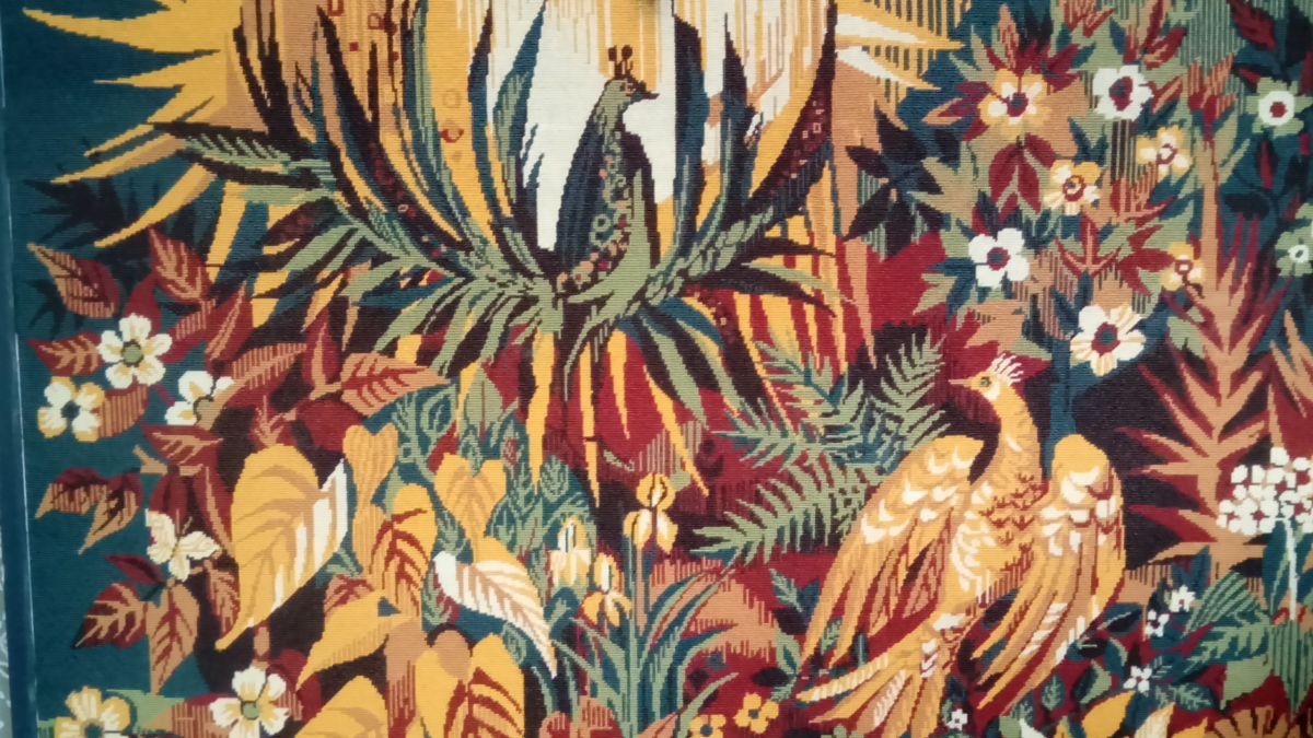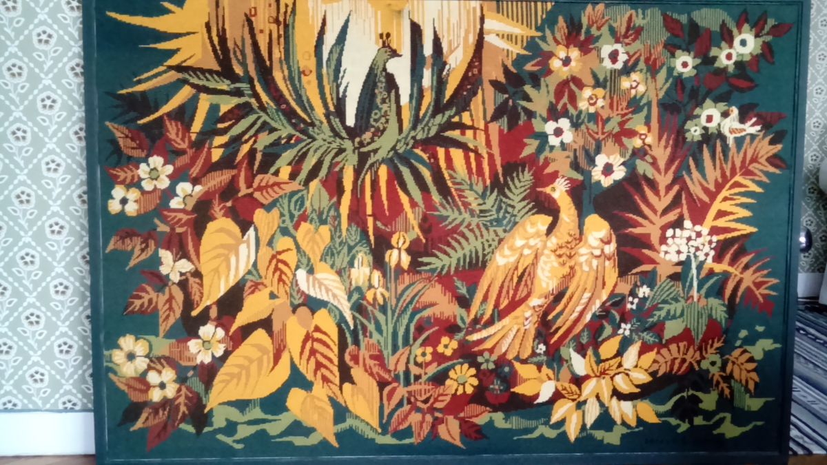 Tapisserie ancienne signée Hervé Lelong représentant un paysage onirique avec des oiseaux de paradis sur support bois.