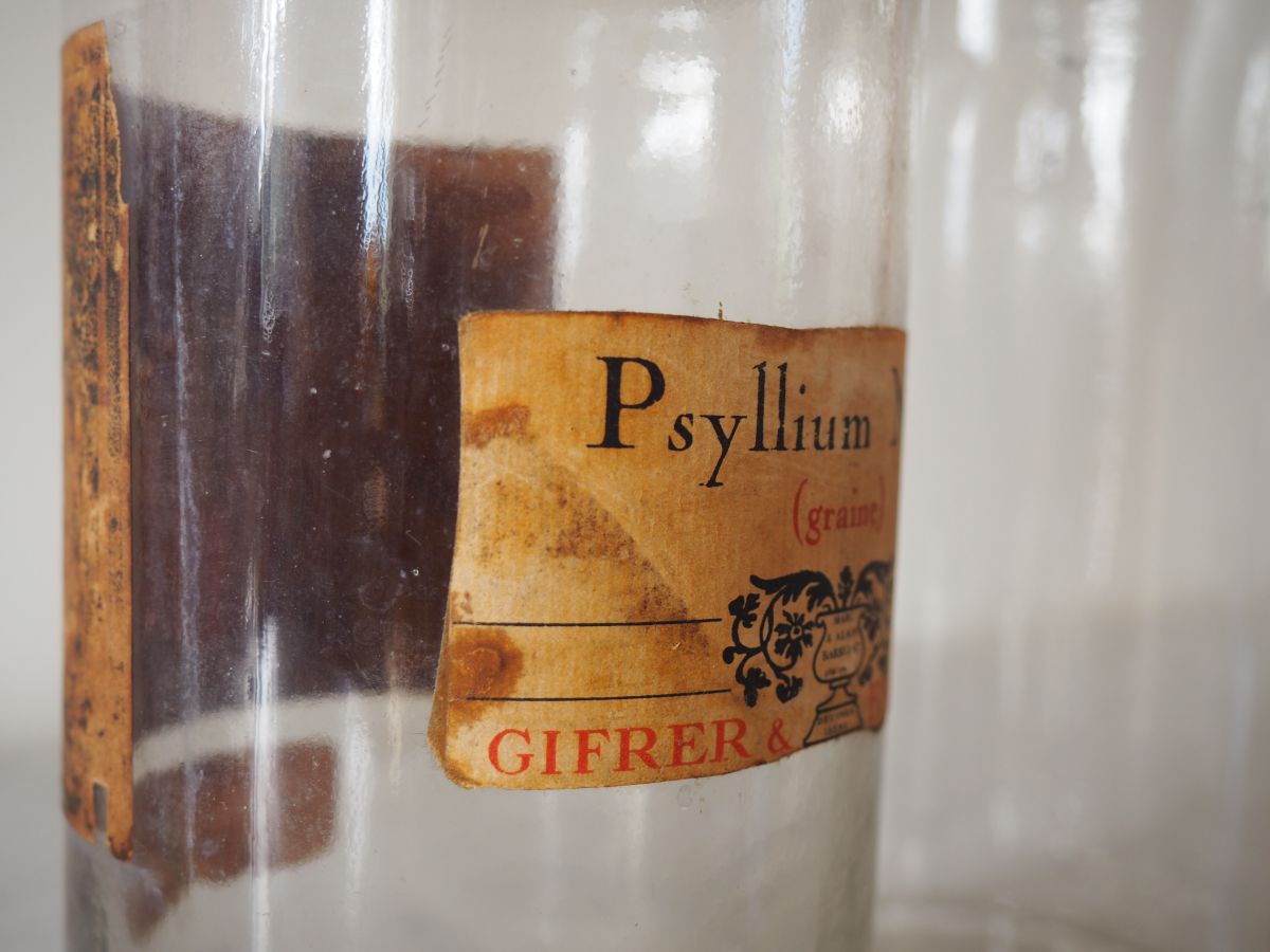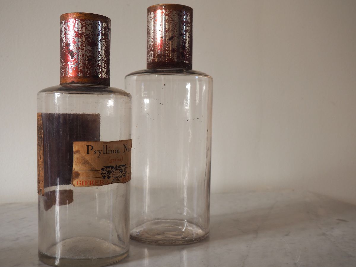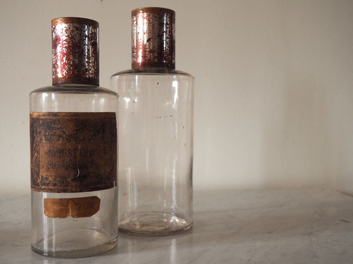 Lot de 2 bocaux à pharmacie en verre transparent avec bouchons métalliques verticaux et étiquettes d’origine sur l’un avec marques d’usage.