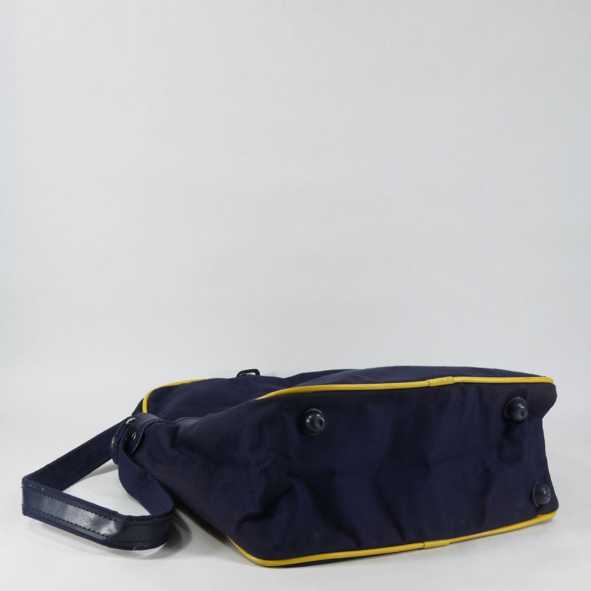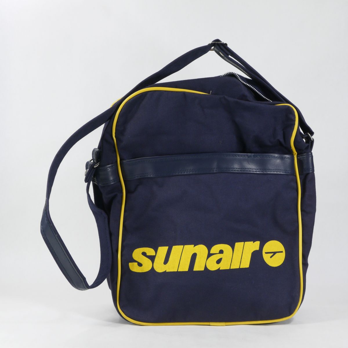 Sac vintage publicitaire Sunair, en toile bleu sombre et plastique. Etat neuf mais il manque un des quatre petits pieds.