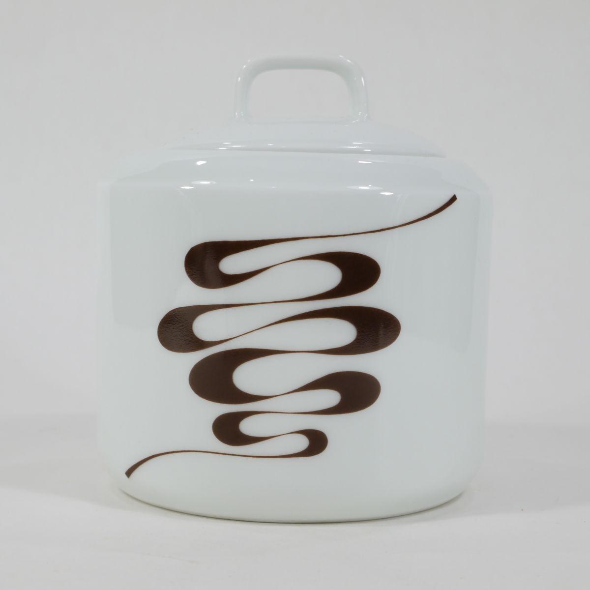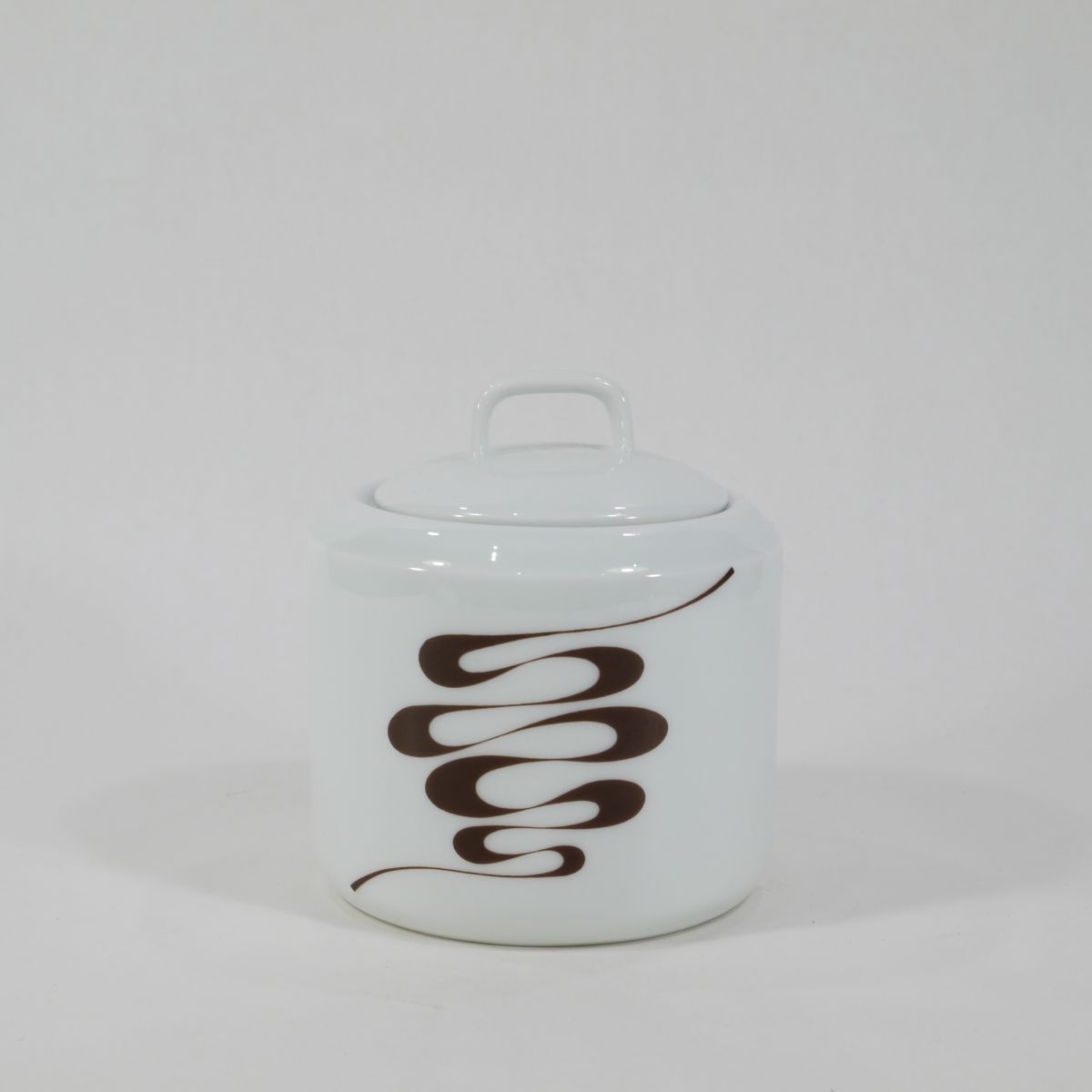 Sucrier 70s en porcelaine du Berry, au décor "slalom", à la fois sobre et vintage. Très bon état. Nous vendons également une cafetière ainsi qu'un saladier avec le même motif.