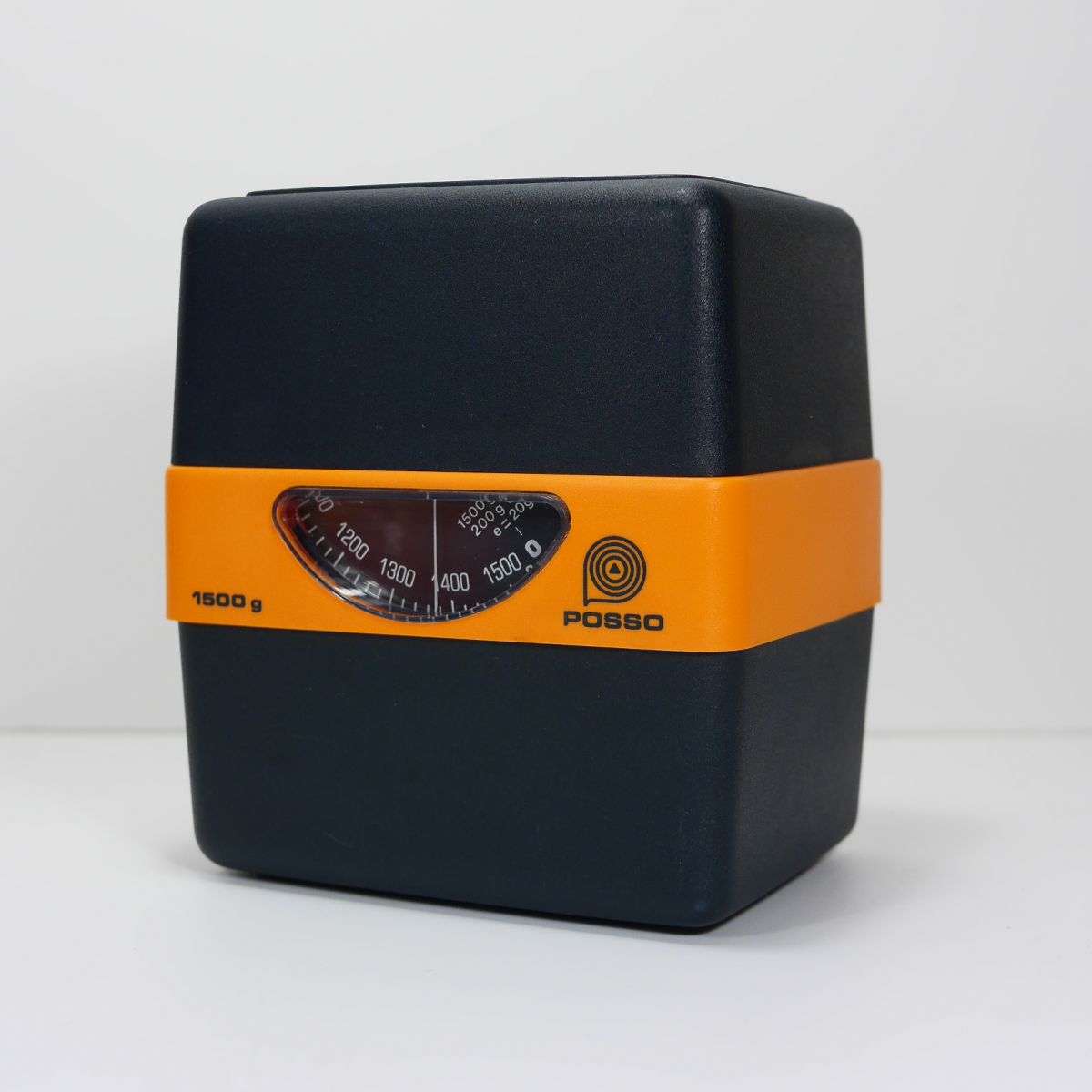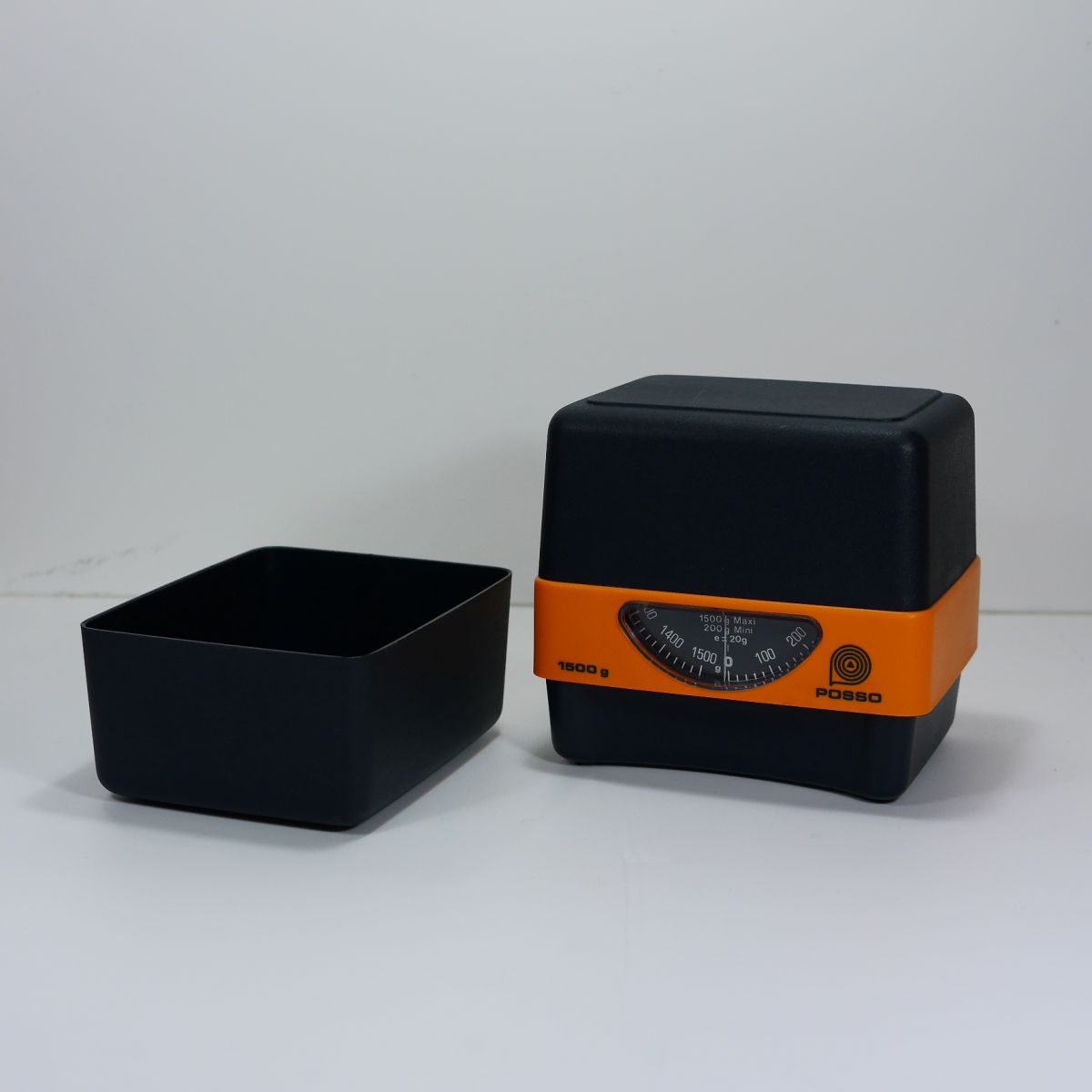 Balance de cuisine Pooso en plastique mat noir et orange. Bon état esthétique et de fonctionnement.