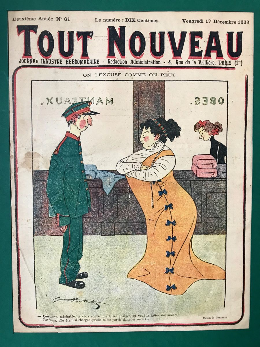 Tableau de la couverture du journal illustré en couleur TOUT NOUVEAU sorti en décembre 1903 « On s’excuse comme on peut ».