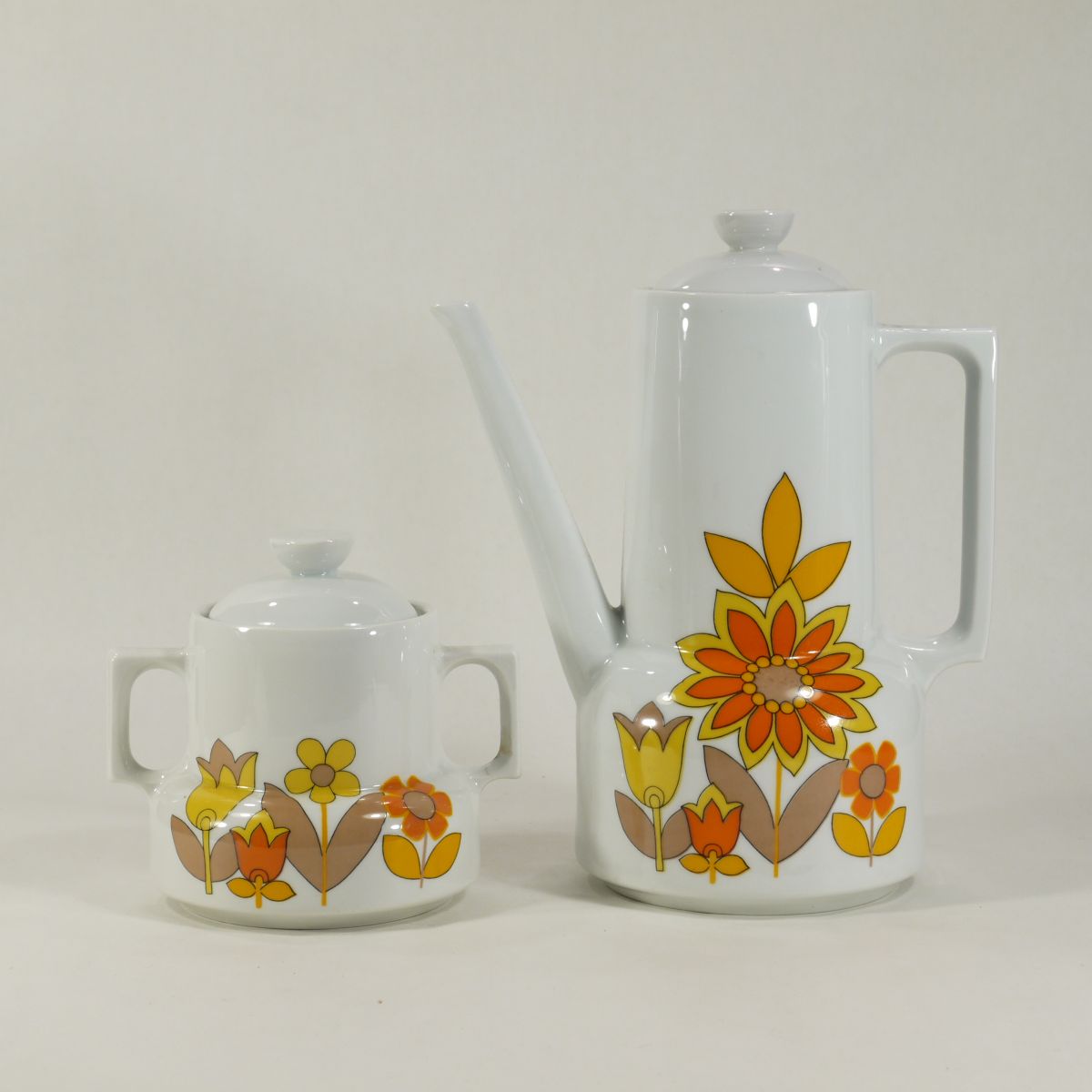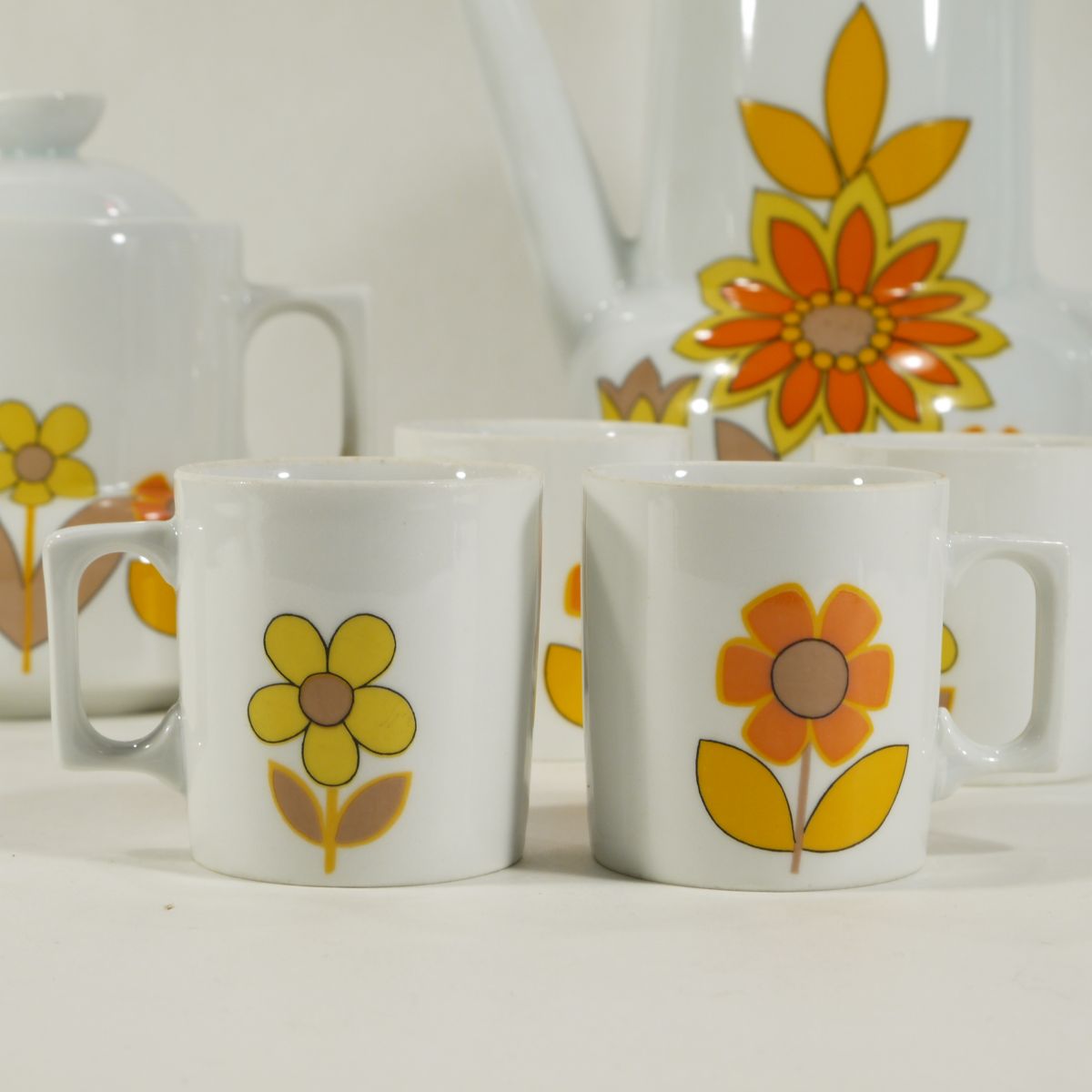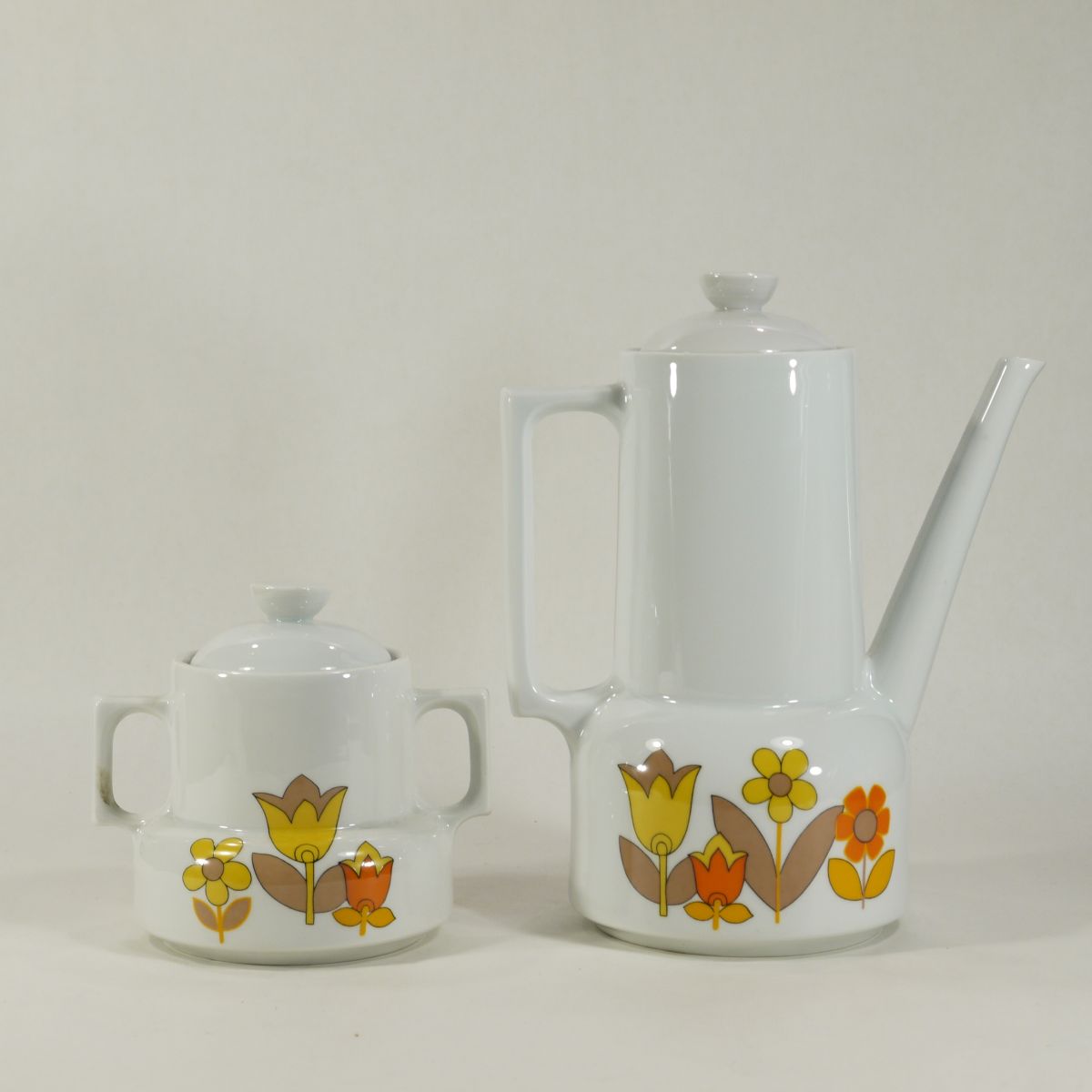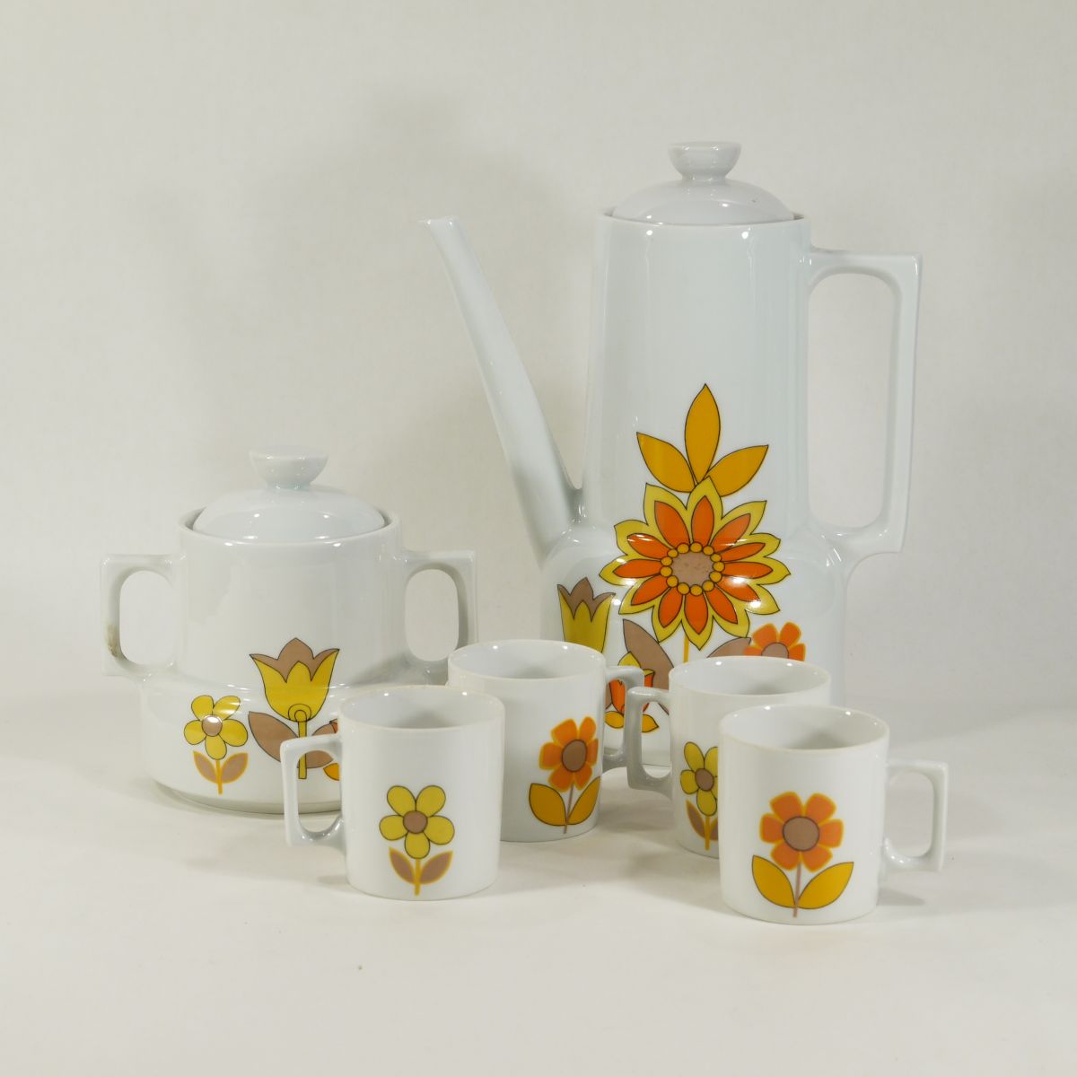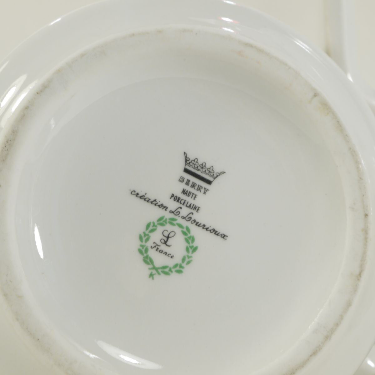 Service à café en porcelaine du Berry, siglé "création L. Lourioux". Comprenant une cafetière, un sucrier et quatre tasses. Les décors sont différents de chaque côté de chaque pièce. Nous vendons également une soupière de la même collection.