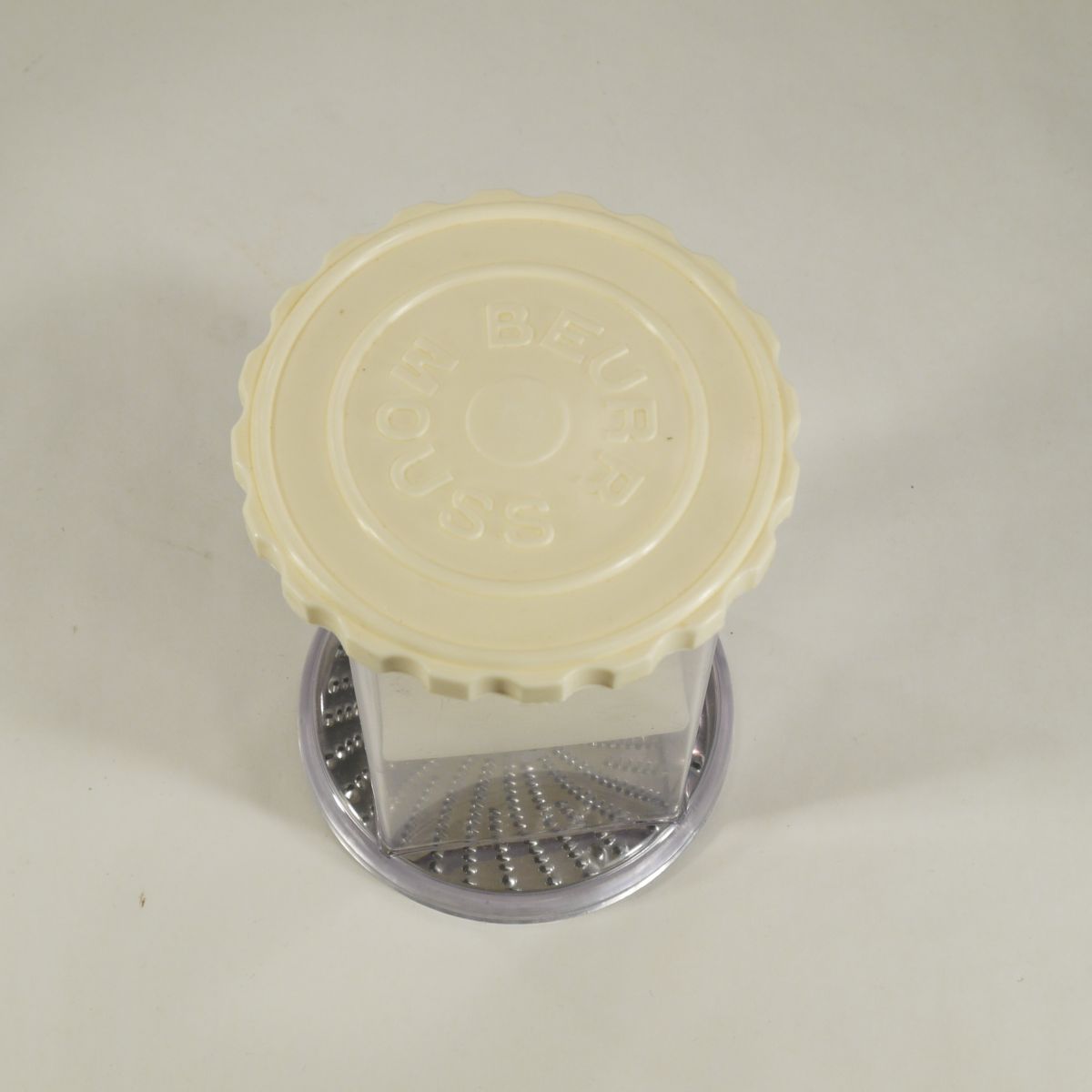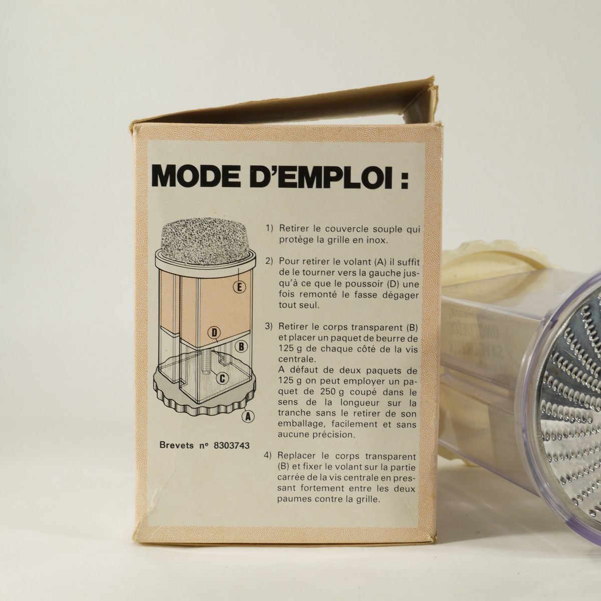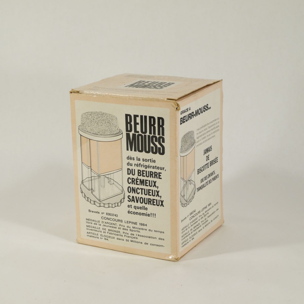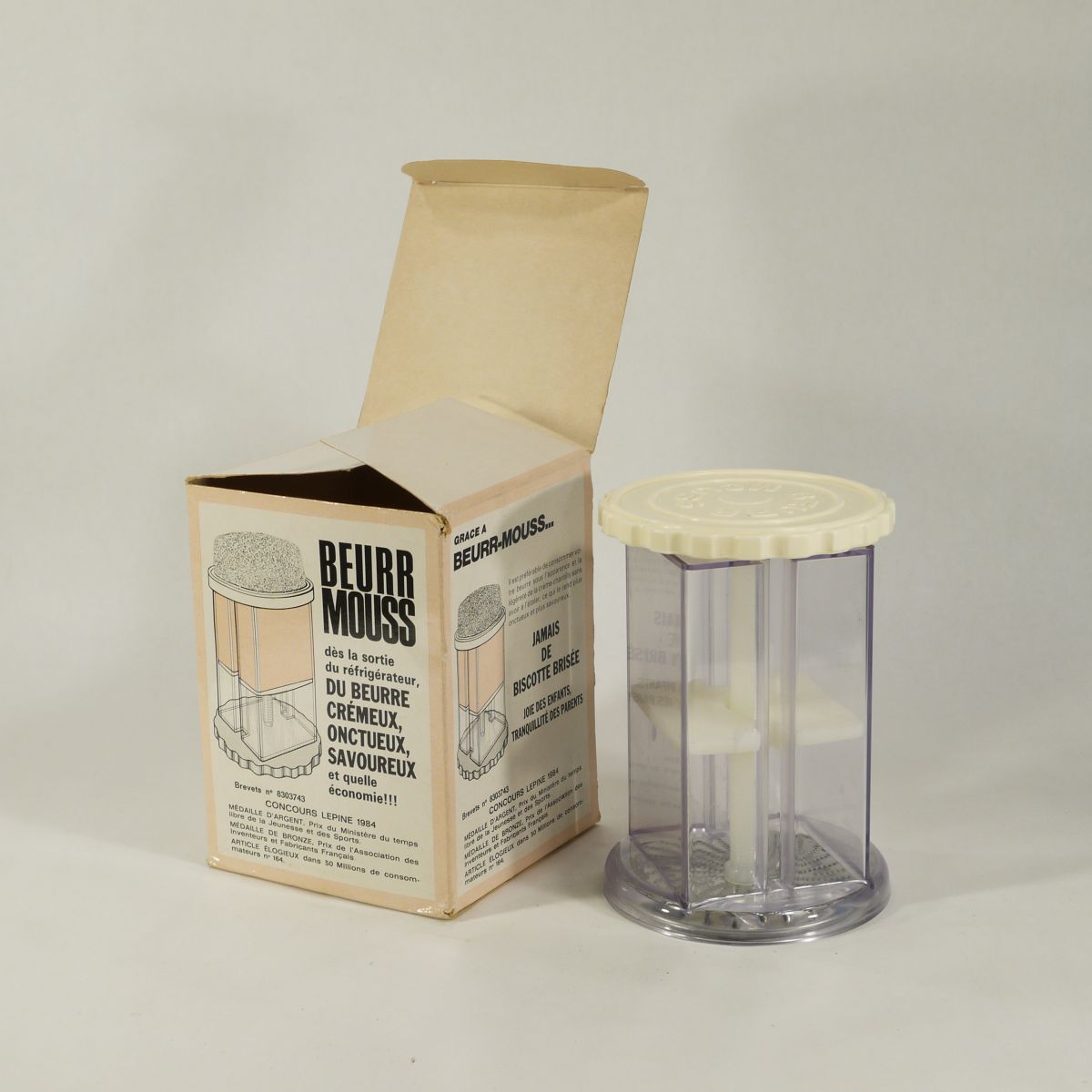 Gadget culinaire du concours Lépine 1984, servant à fabriquer du beurre mou à partir de beurre dur. Modèle original, n'a jamais servi. Objet encore édité aujourd'hui sous plusieurs marques aujourd'hui.
