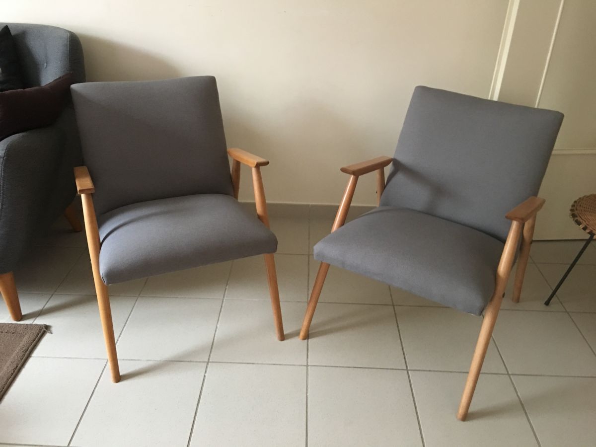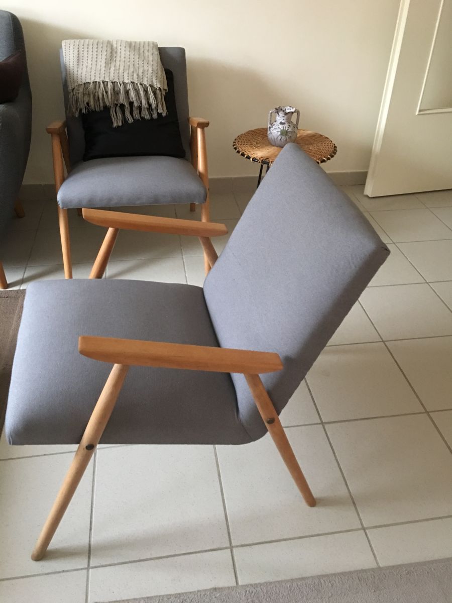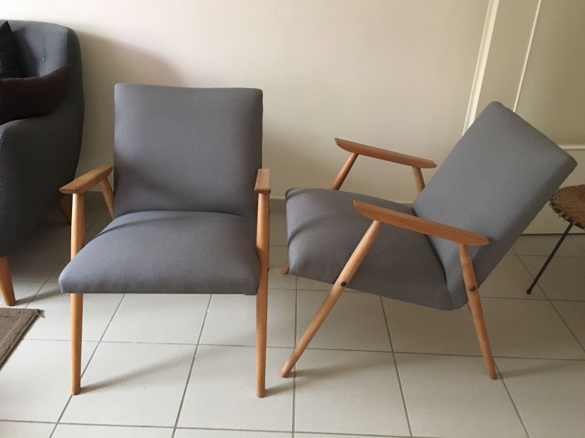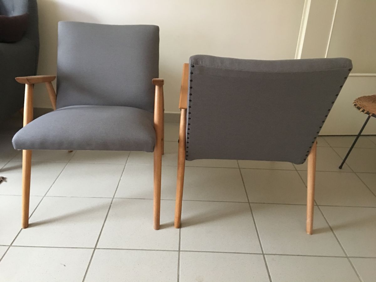 Très belle paire de fauteuils scandinaves des années 60 en bois blond (hêtre), entièrement retapissés (tissu gris neuf), assise et garniture refaites à neuf, pieds compas, hauteur totale 69cm, hauteur assise 40cm, assise 48x44cm, dimensions totales (cm) : L.54xH.69xP.65, très bon état.