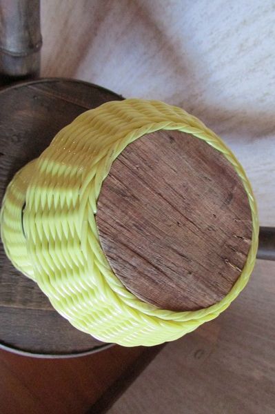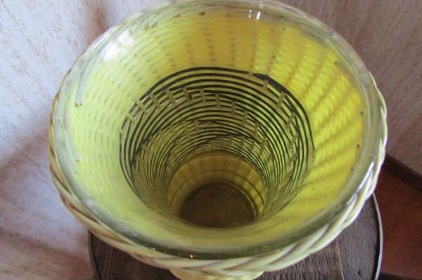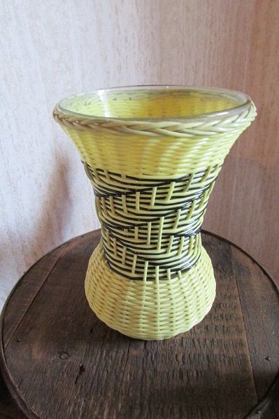 Joli vase en verre sur socle bois et tressé de scoubidous jaune et noir. En parfait état. Diamètre : 14,5 cm , Hauteur : 20,5 cm