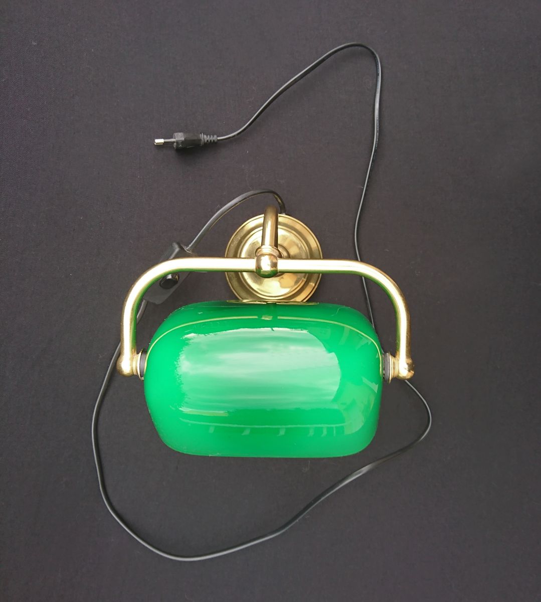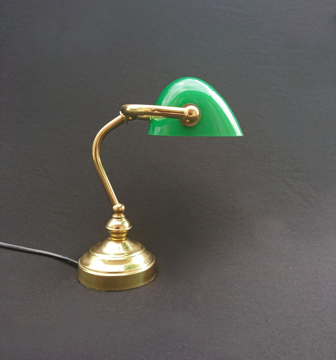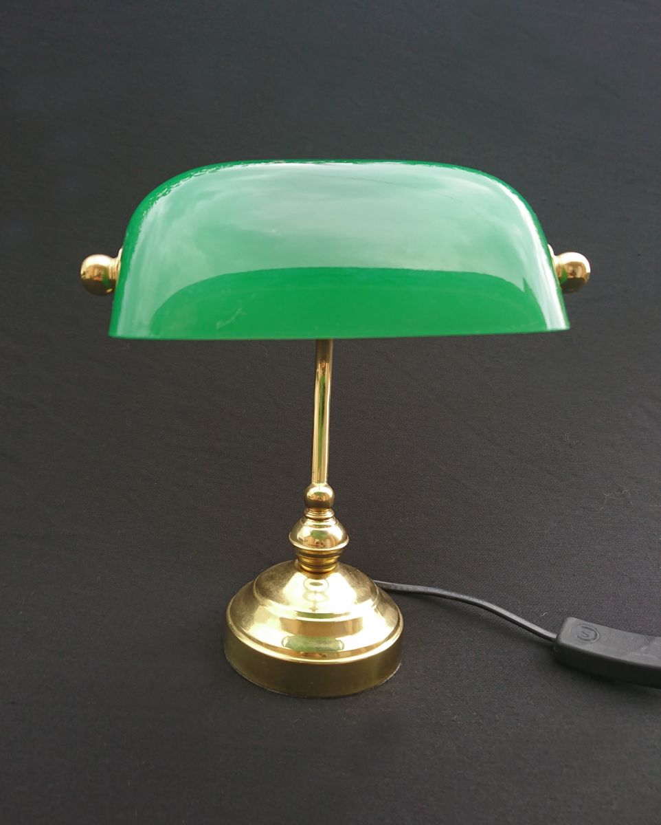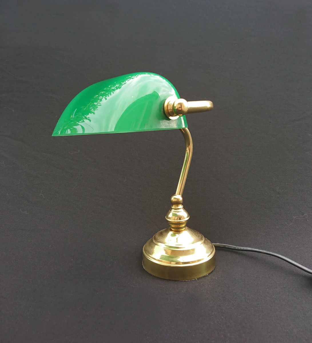 Lampe de banquier ou notaire en laiton doré, réflecteur en opaline verte. Patine dorée et patine d'usure. Sous le pied; feutrine noire de protection.