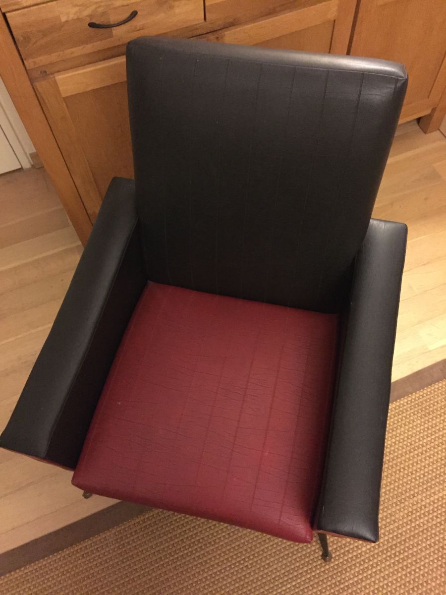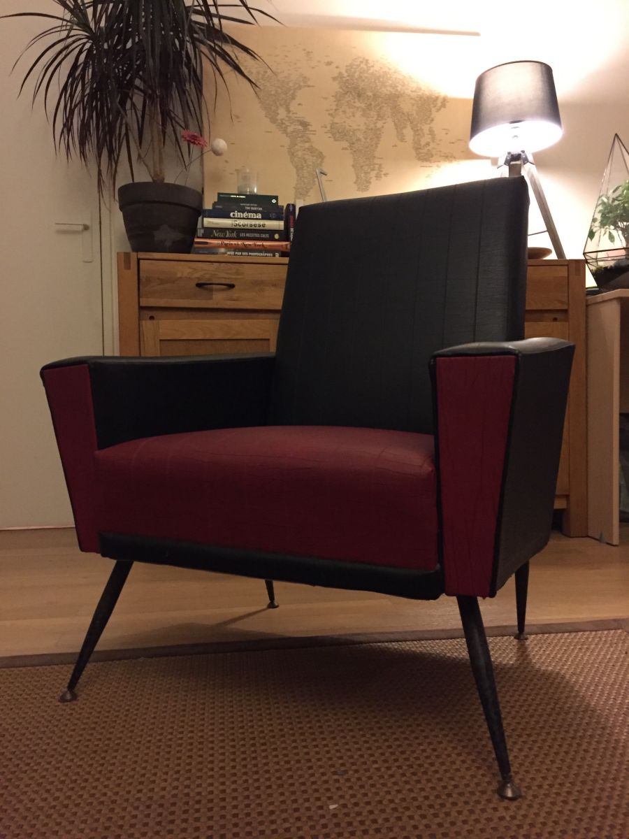 Je vends ce fauteuil vintage pieds compas en skaï mat légèrement quadrillé de style rockabilly.