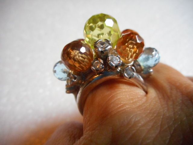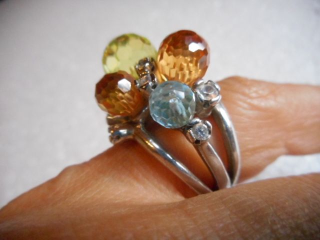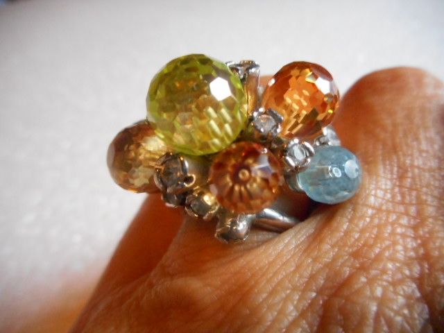 Très belle bague en ARGENT avec une grappe de boules en verre à facettes et des brillants.2 Boules bleues, 4 boules ambrées et une grosse boule centrale citron vert. La partie supérieure mesure 3,5 X 2,4 cm ! Assez lourde au doigt ! Poinçon 925