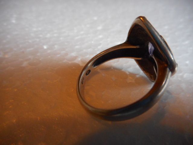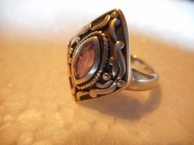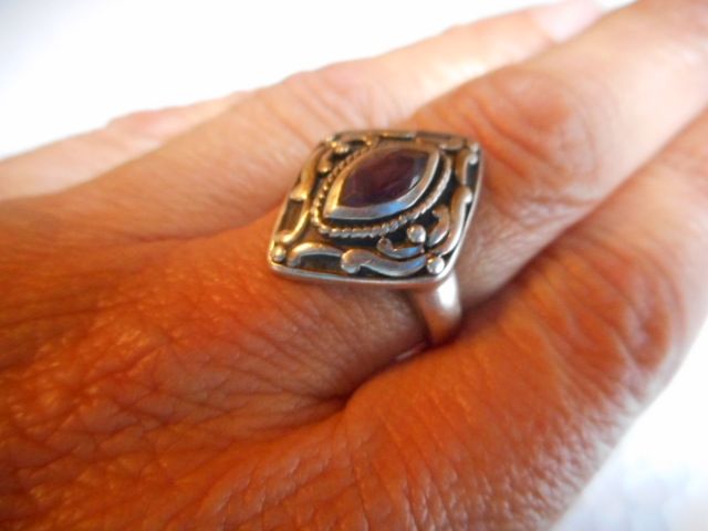 Bague vintage des Années 80' en Argent. De forme losange avec une partie améthyste au centre. Des décors argent sur les côtés. Poinçon 925.
