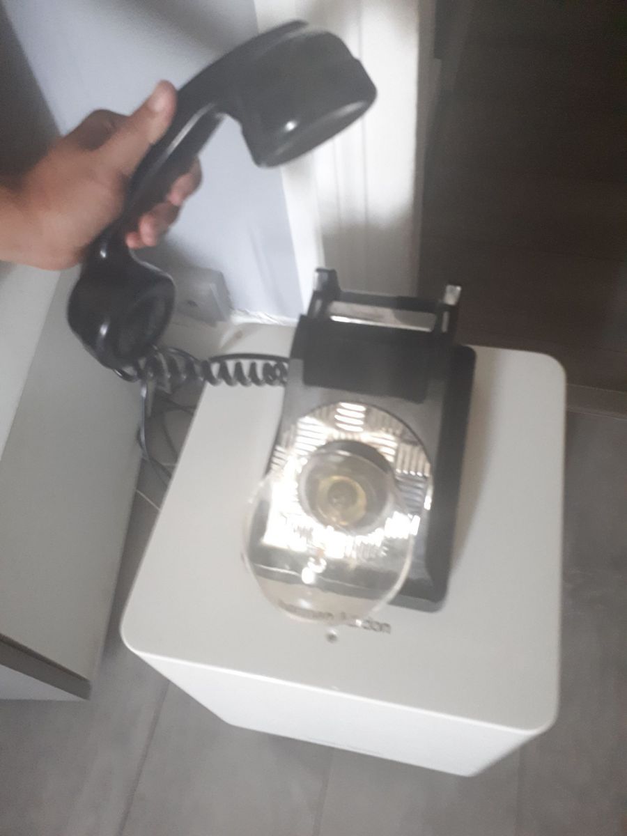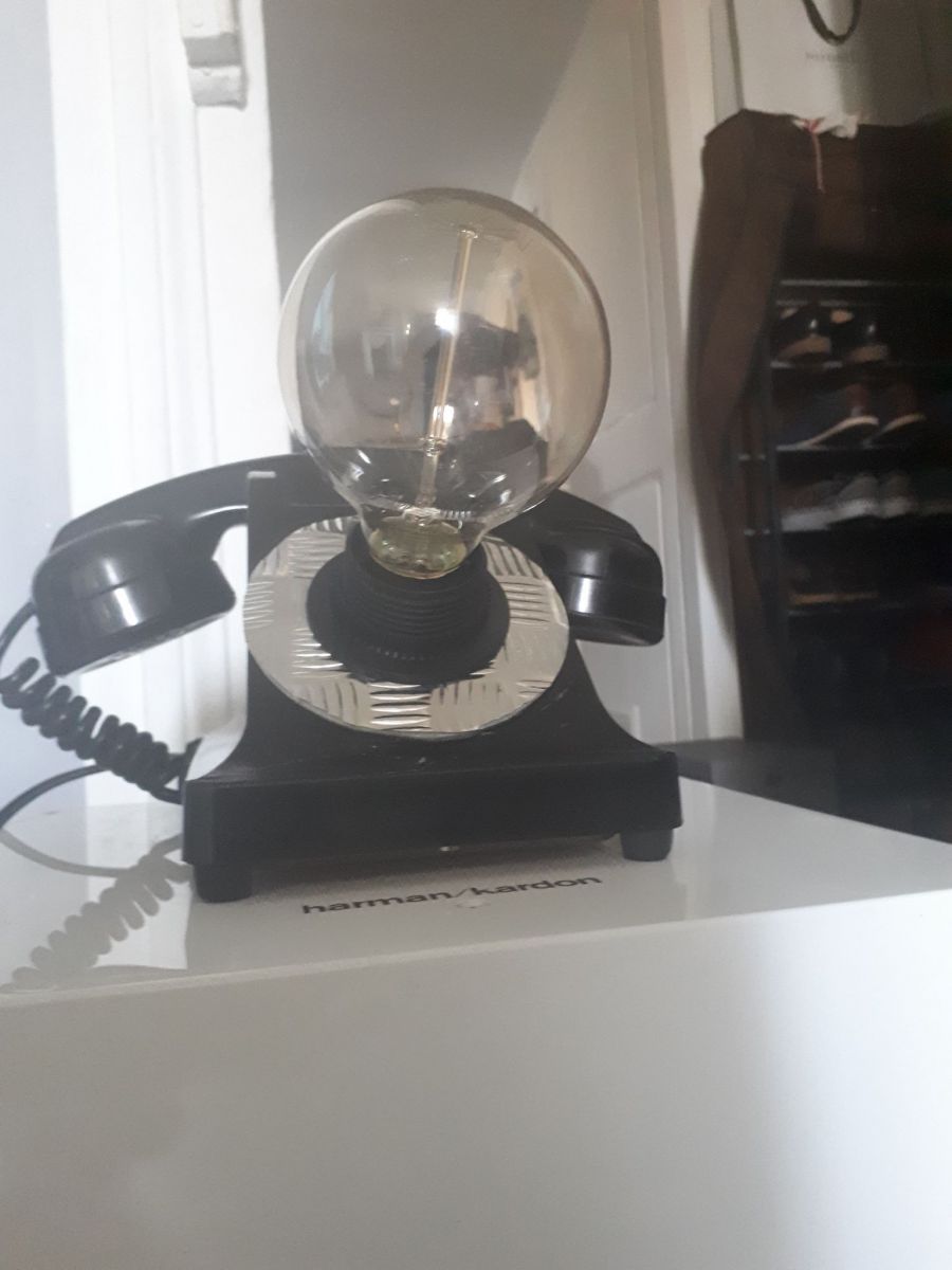 Née d'un téléphone français des années 50, en bakélite noire, chiné en brocante.