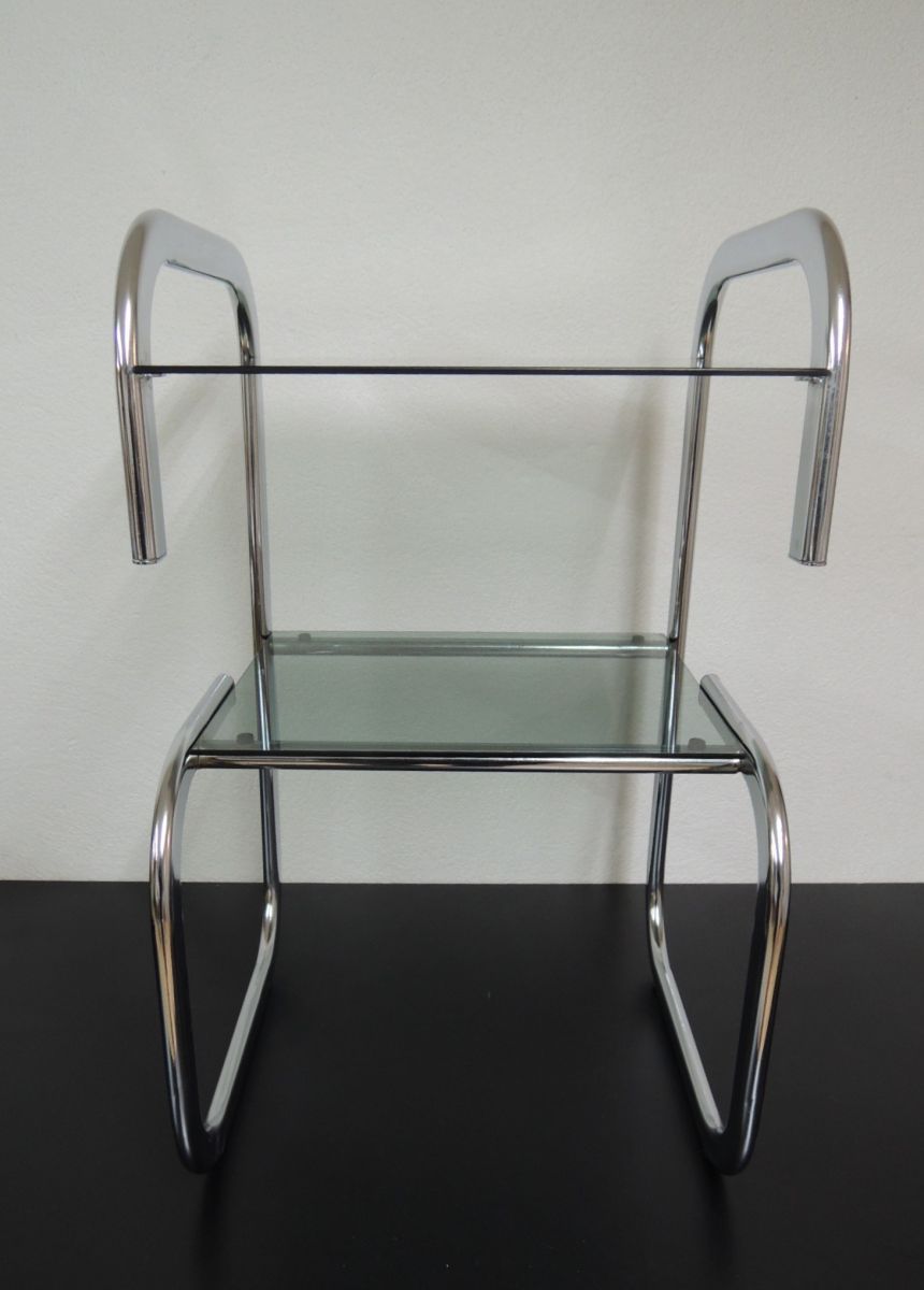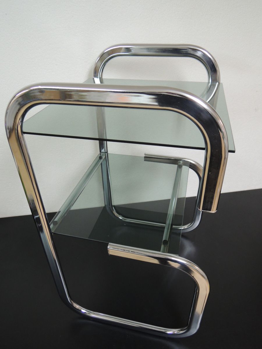 Table de chevet vintage, début 70, métal chromé et tablettes en verre teinté bleu-vert, chants polis, bon état, chrome intact, petit éclat sur verre. H63xL36XP36 cm. 6 kg