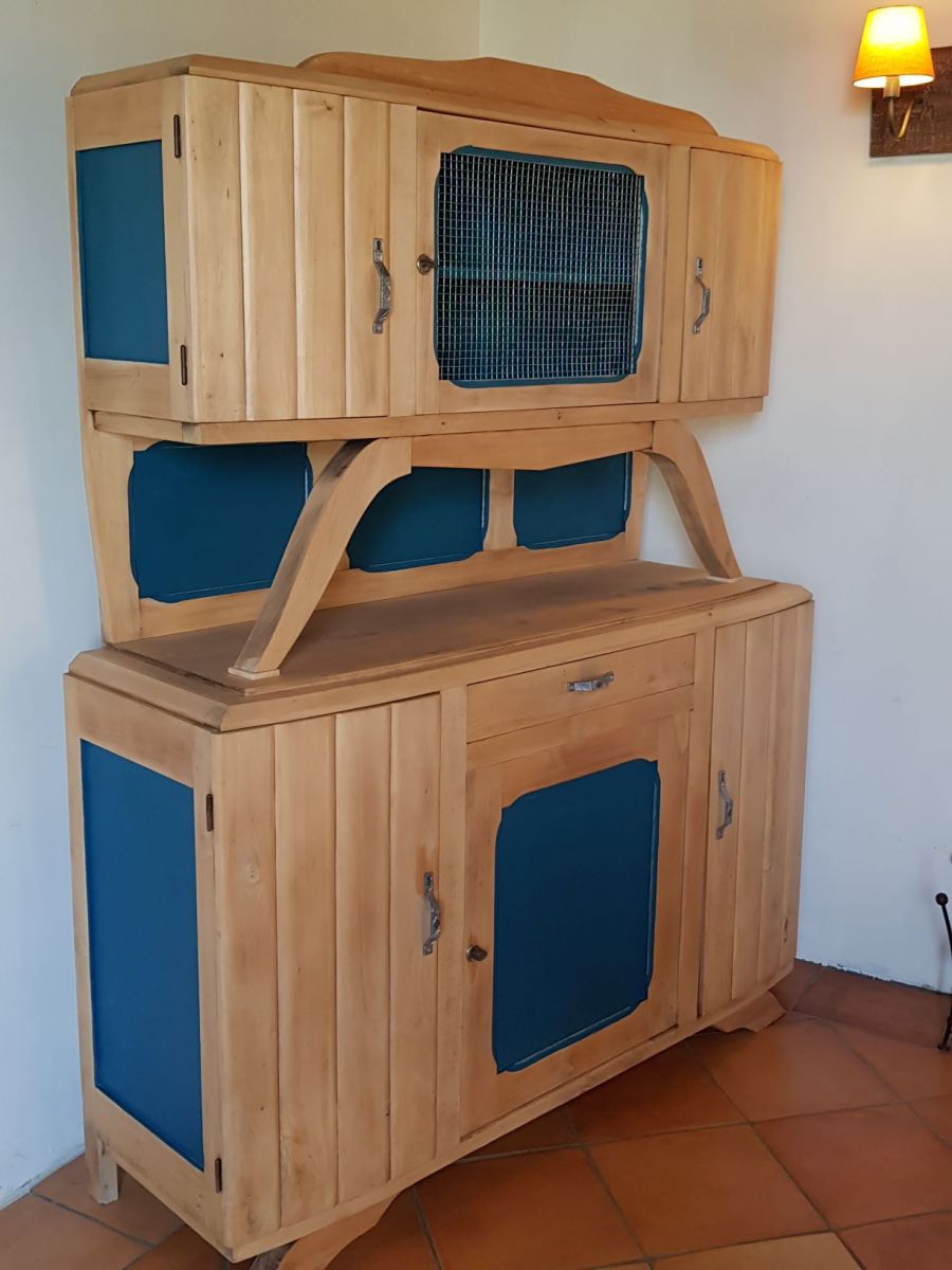 Buffet en peuplier et contreplaqué de l'entre deux guerres. en le décapant intégralement, j'ai choisi de valoriser la patine blonde du bois par un vernis et de peindre les parties en contreplaqué en bleu profond méditerranée pour lui donner un aspect plus moderne. Les poignées sont d'origine. dim: L:151 - H: 195 - p:50