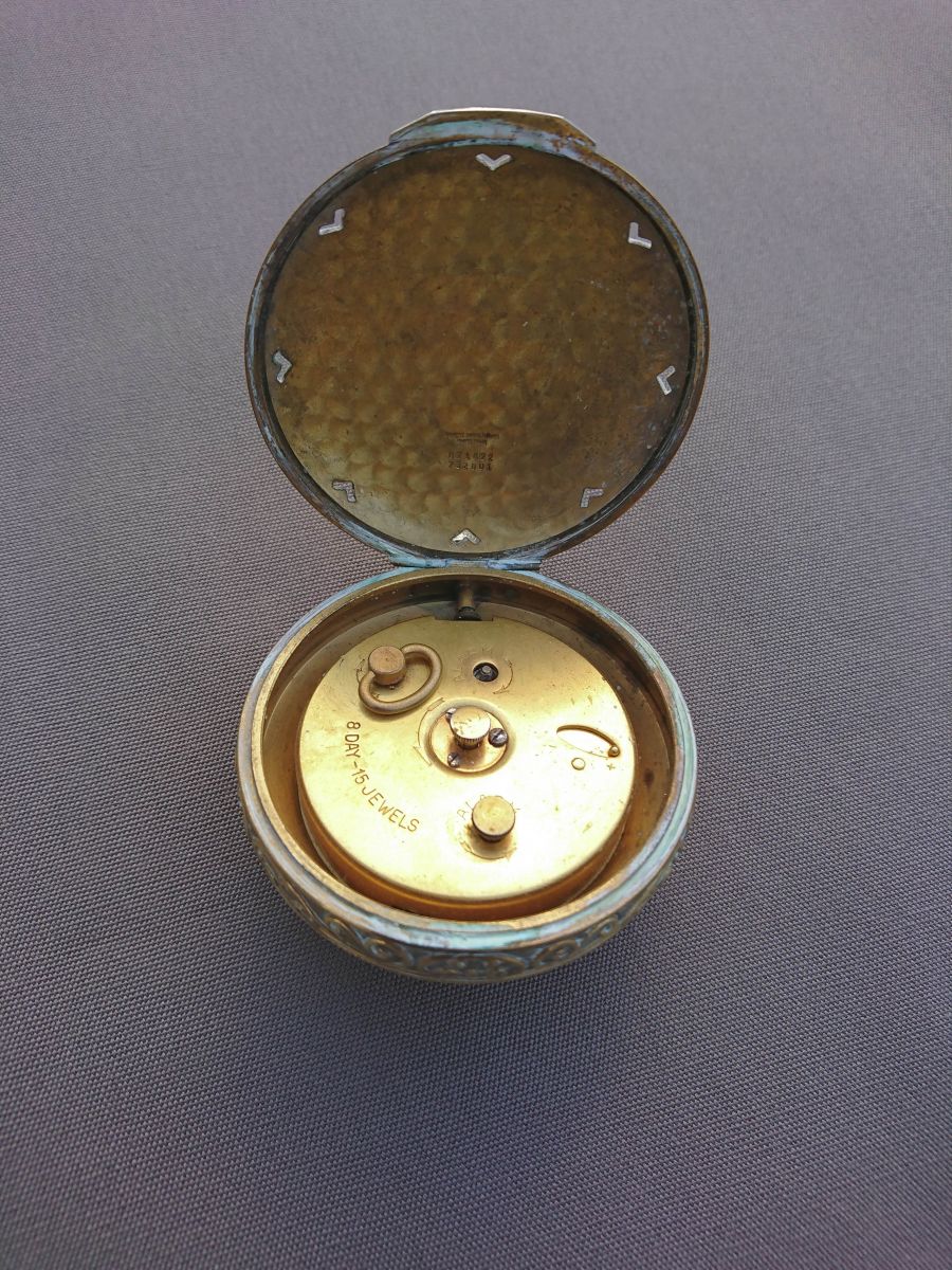 Rare et superbe montre de poche Ernest Borel modèle "Versailles" 8 day - 15 jewels, fabrication Suisse. Cadran à chiffres romains noir et blanc, superbes décorations de rouleaux et feuilles d'acanthe. Un cristal bombé protège le cadran, un dos articulé abrite le système de réglage de la montre.