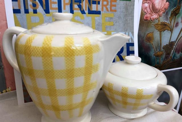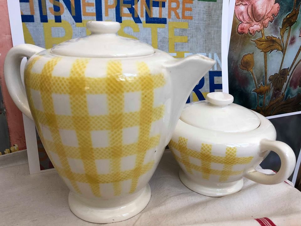 Plongée totale dans les années 50 pour cette théière jaune vichy éclatante et son sucrier.