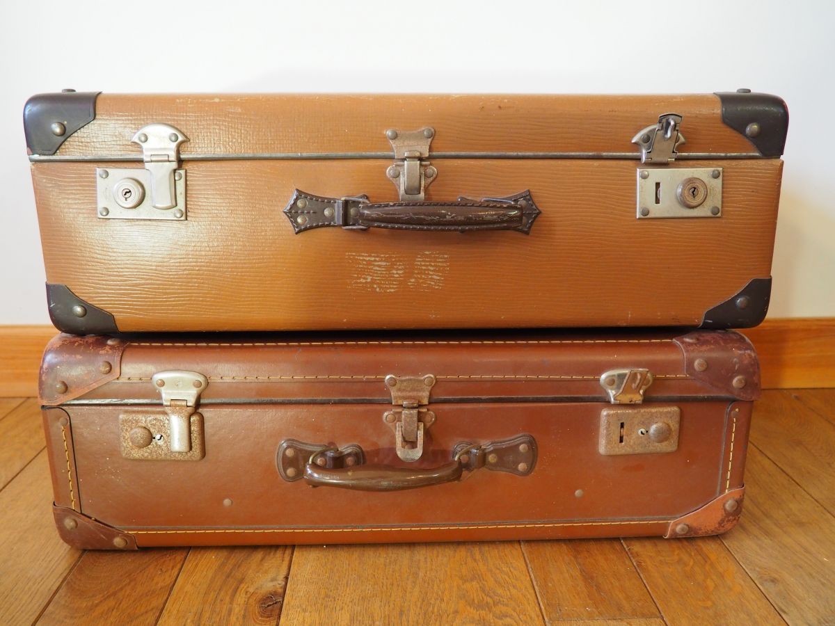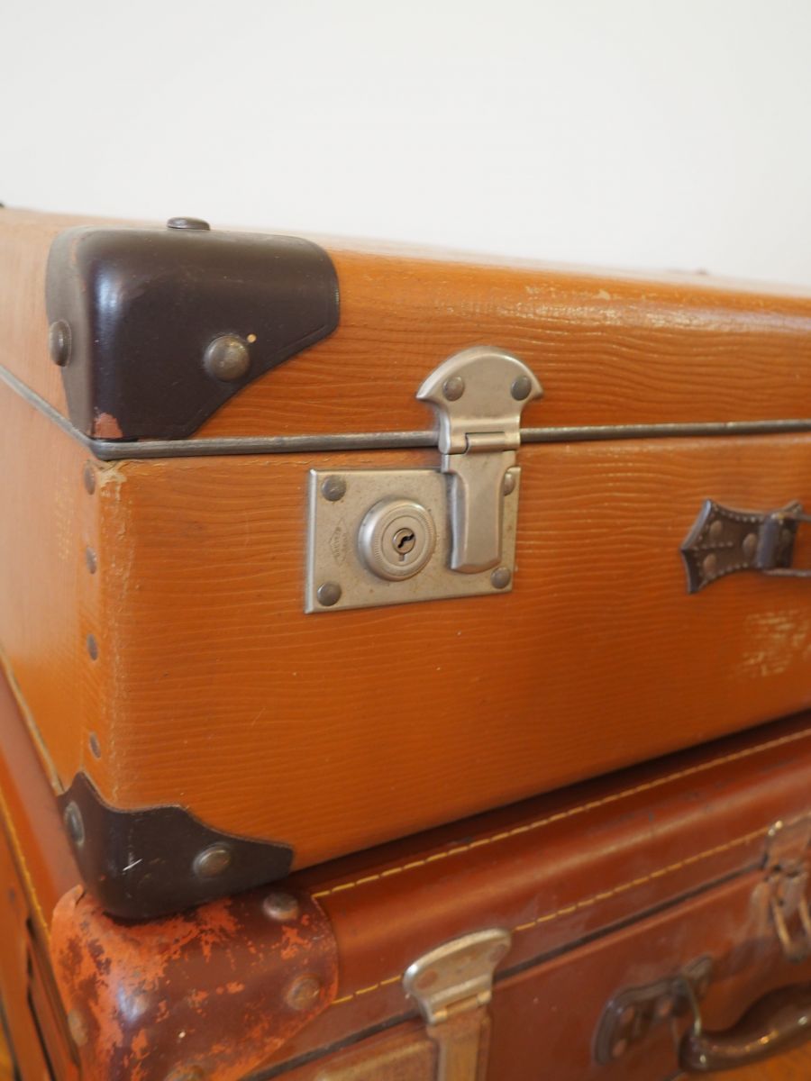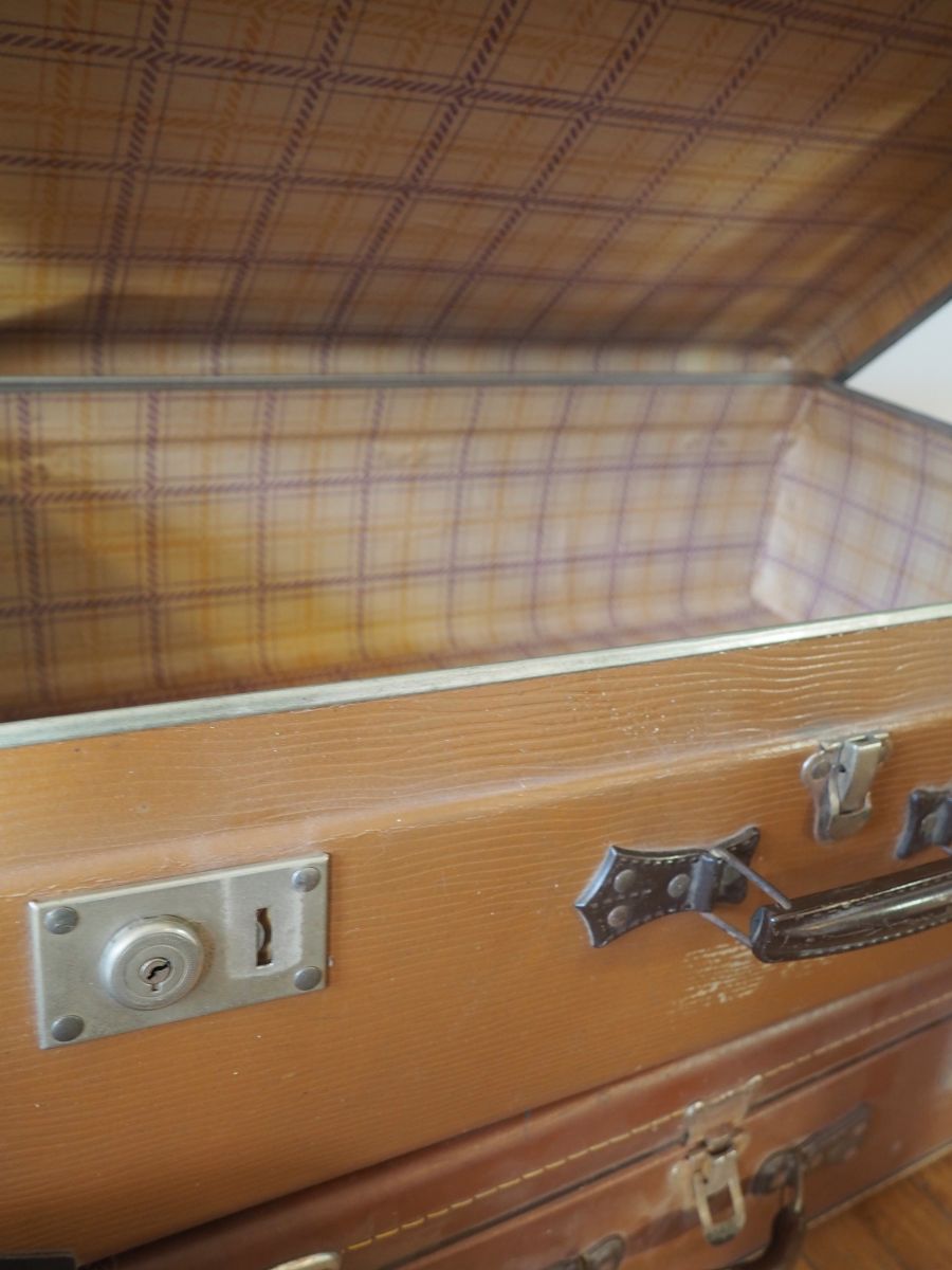 Valise brune aux coins noirs en carton épais d'origine avec marques du temps.